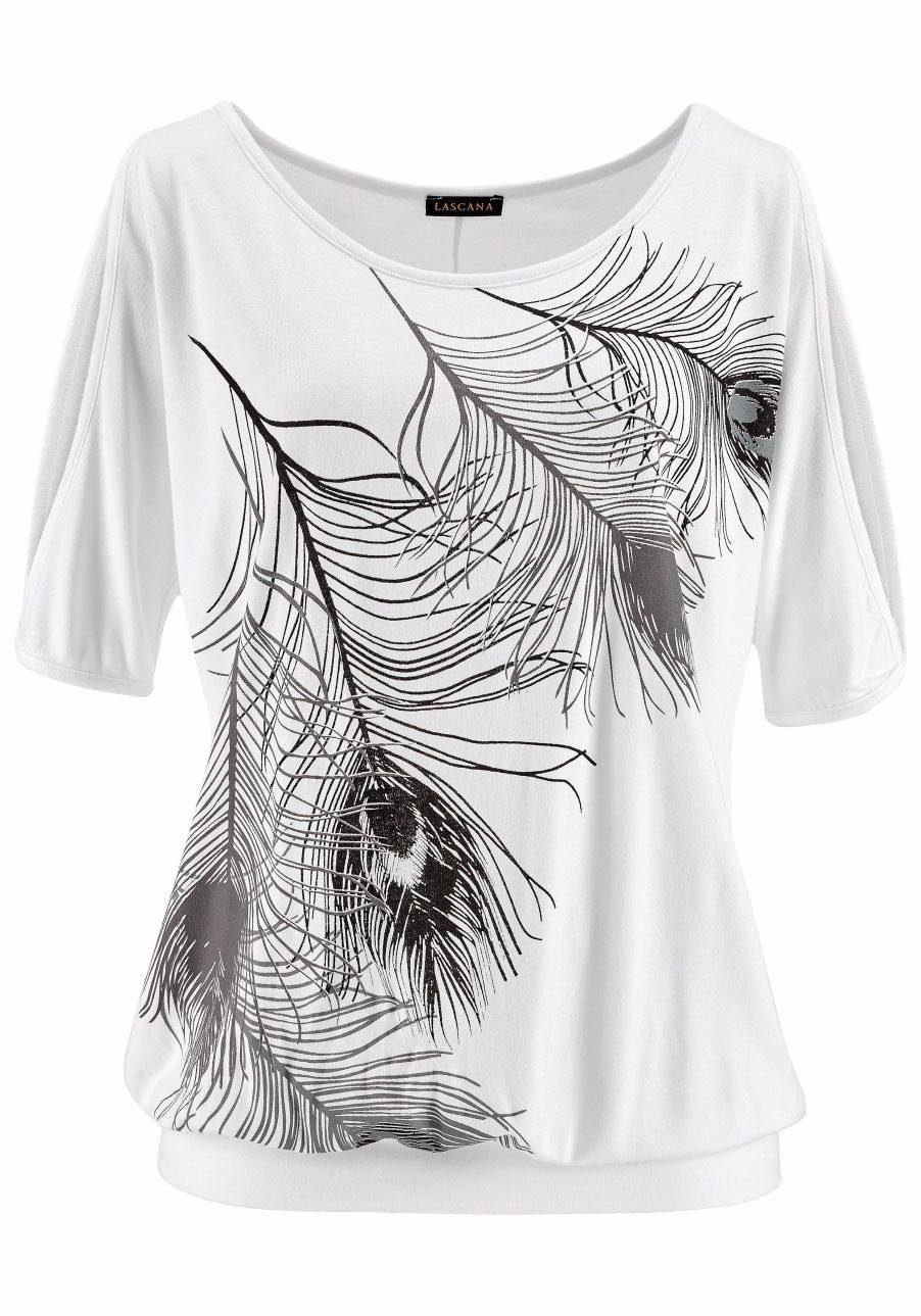 Mit hübschem Federprint: Strandshirt von Lascana. Lässig weit geschnittene halblange Ärmel mit Seitenschlitzen für Tragekomfort. Länge ca. 64 cm. Aus weich fließender Viskose.