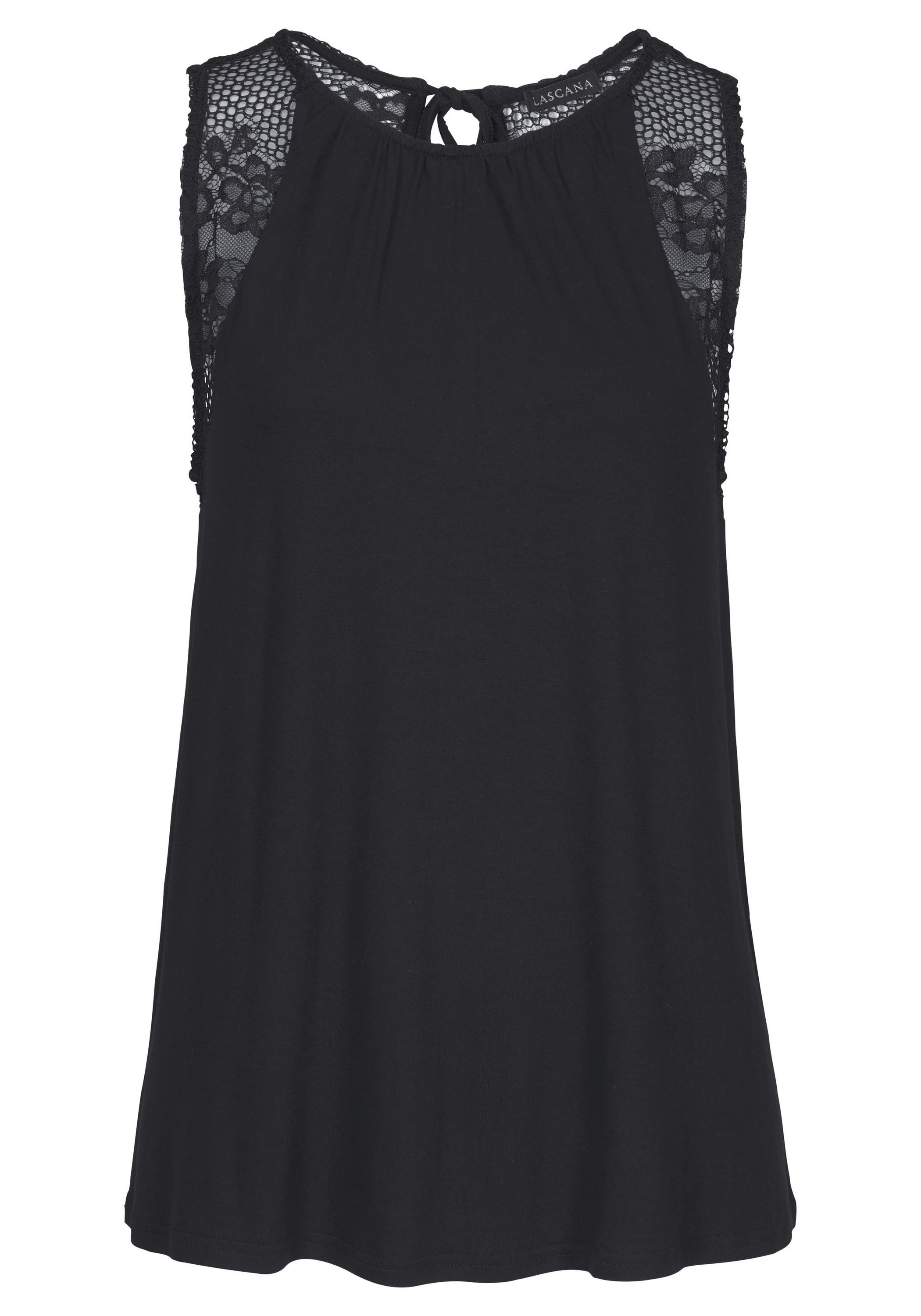 Mit Spitzeneinsatz vorn an den Armausschnitten und am oberen Rücken. Im Nacken mit langem Schlitz und Bindeband. Leicht ausgestellte Form. Länge ca. 64 cm. Aus 95% Viskose, 5% Elasthan. Spitze: 100% Polyamid.