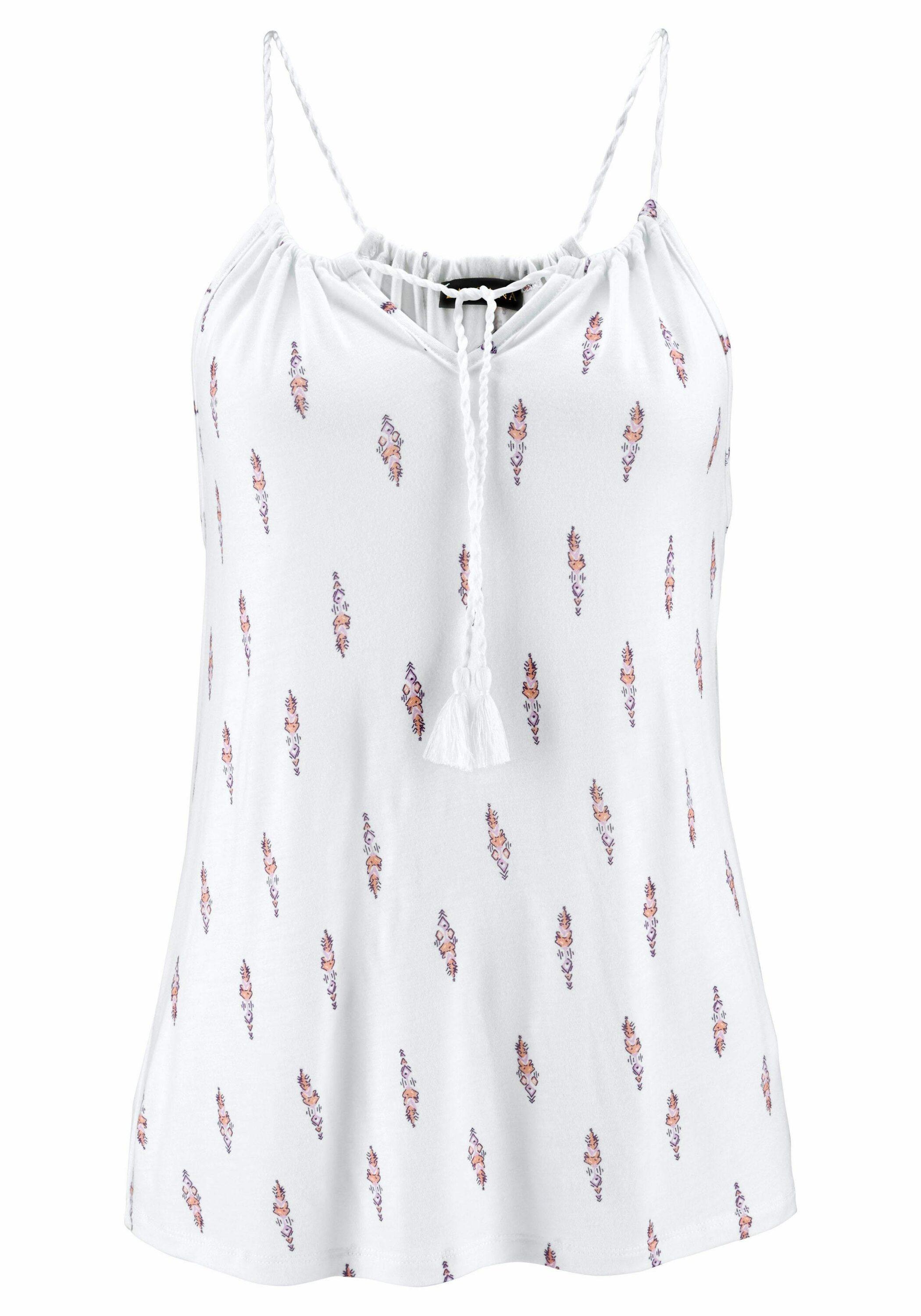 Top von LASCANA mit gedrehten Kordelträgern und Quasten vorne am Ausschnitt. Gerader Saumabschluss. Allover bedruckt, jedes Teil ein Unikat. Länge ca. 52 cm. Aus 100% Viskose.