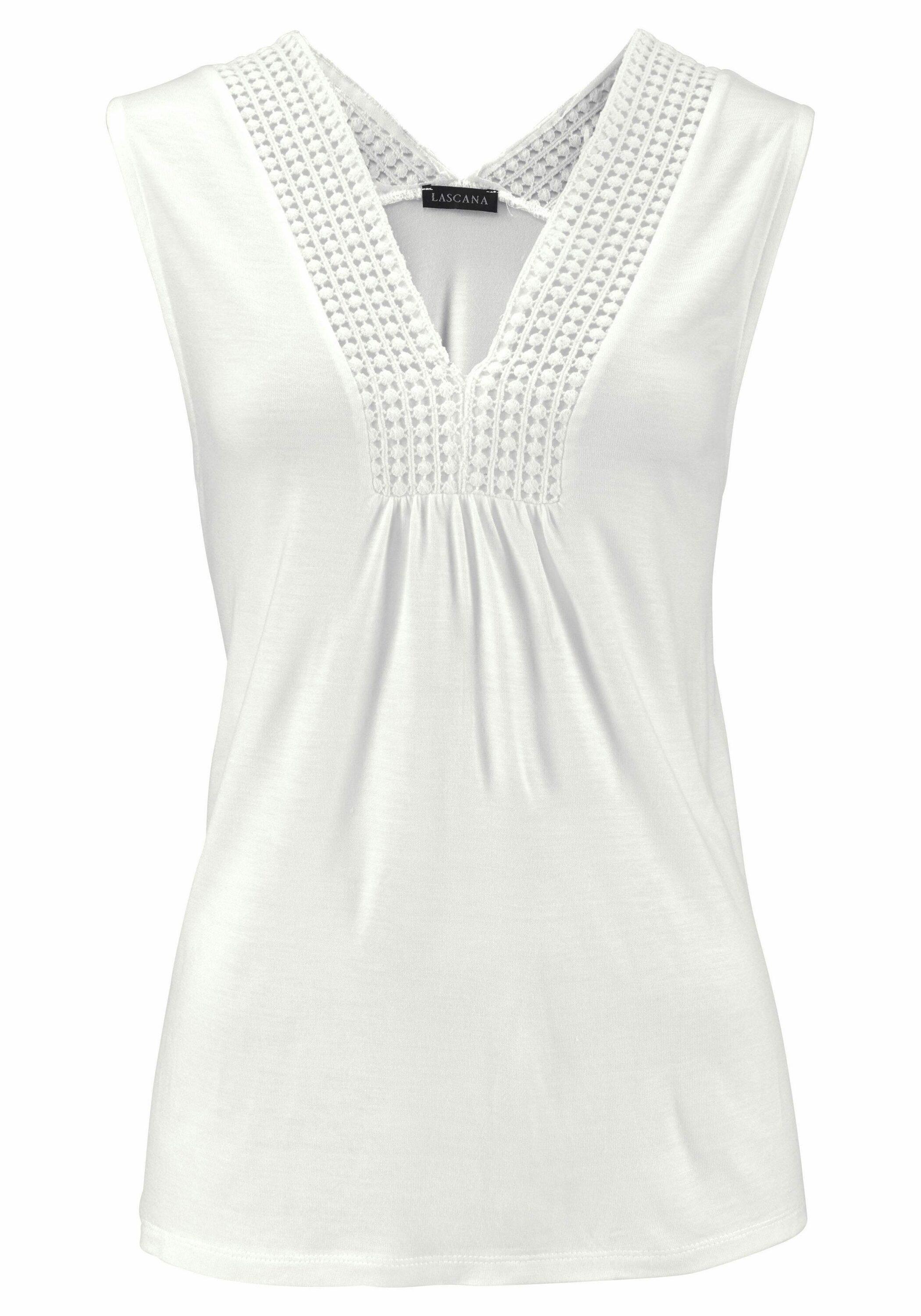 Mit dekorativem Häkeleinsatz vorn und hinten am V-Ausschnitt als besonderem Blickfang. Unter der Brust leicht gerafft. Gerade Saumabschluss. Länge ca. 64 cm. Aus 100% Viskose.