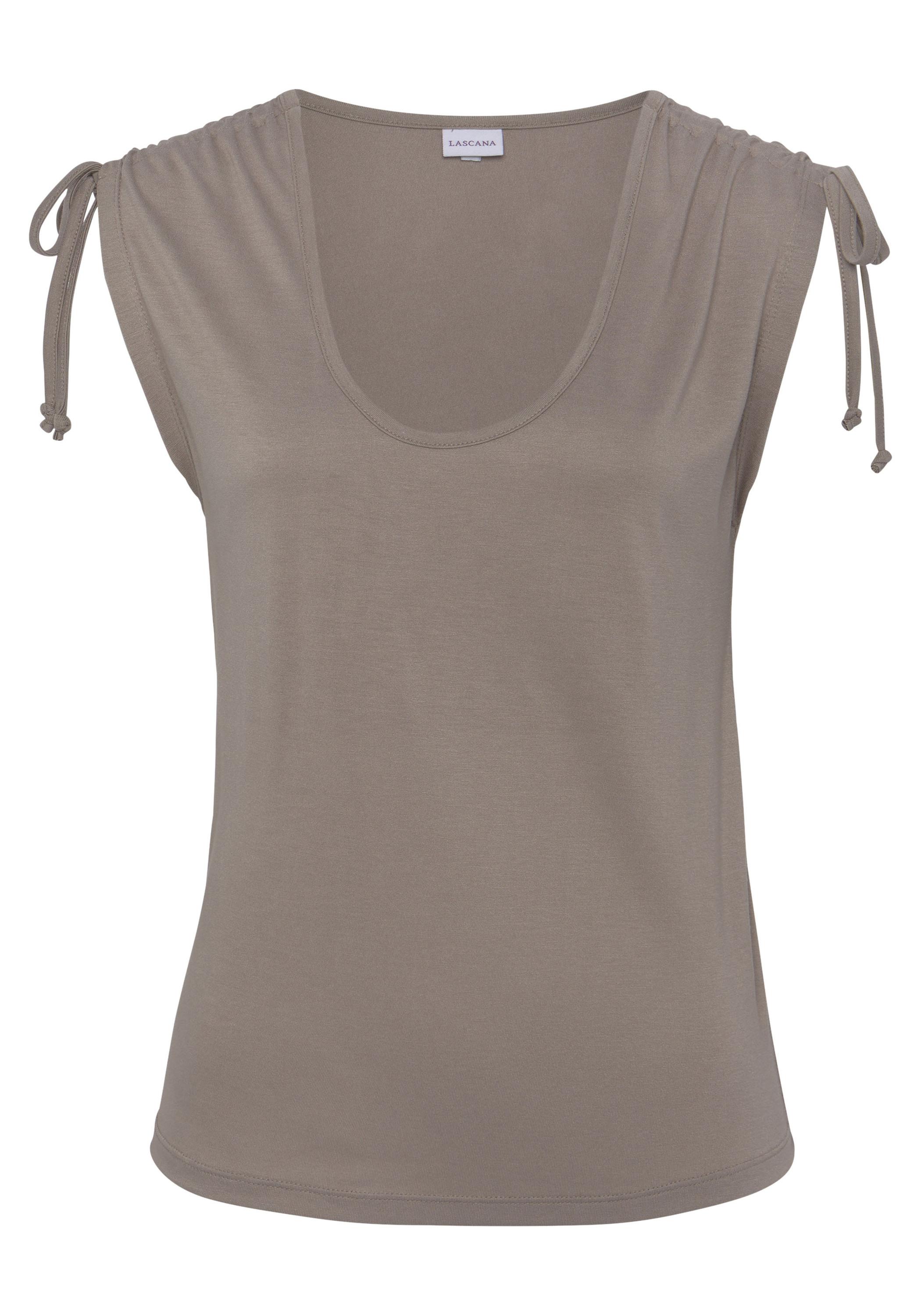 Unifarbenes T-Shirt von Lascana mit extratiefem Rundhalsausschnitt. Schulternähte zum Raffen mit Bindebändern. Taillierte Passform. Vielseitig zu stylen. Weicher Viskosejersey.