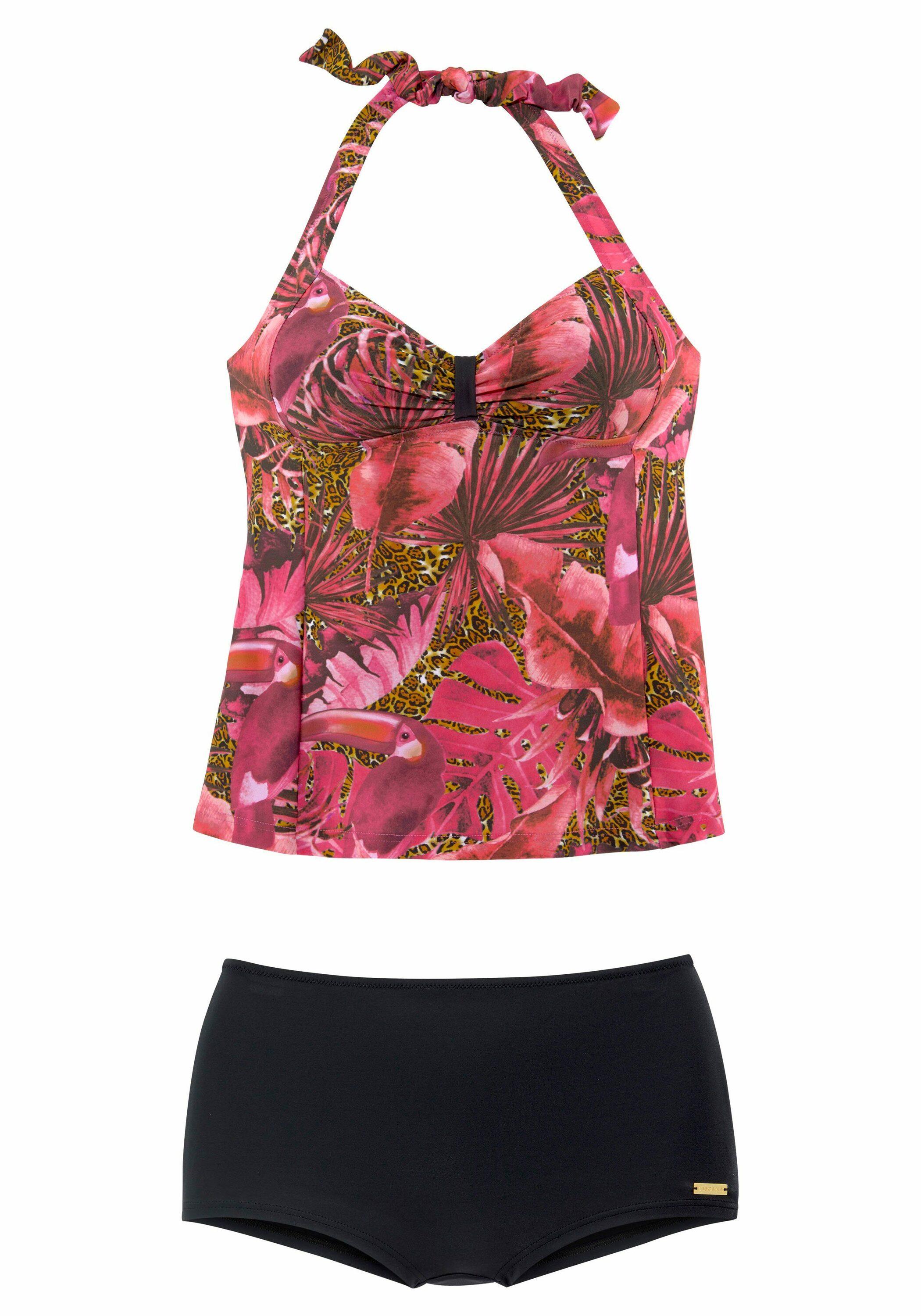 Tankini von Lascana in Dschungel-Optik. Eingearbeitete Softcups. Im Nacken zu binden. Hose in Hotpajts-Form. Obermaterial: 80% Polyamid, 20% Elasthan LYCRA® XTRA LIFE™. Futter: 100% Polyamid