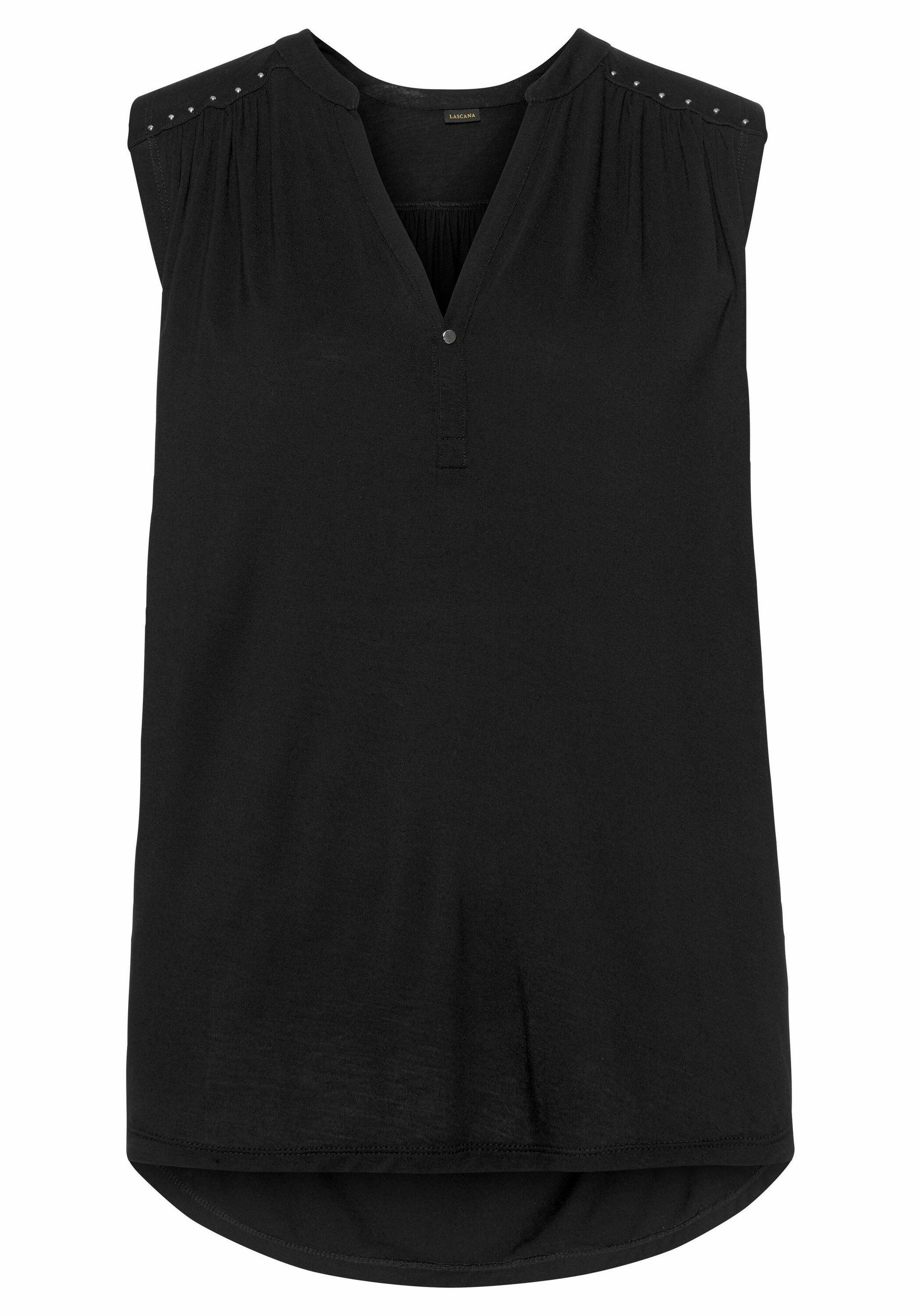 Mit V-Ausschnitt und silberfarbenem Zierknopf. Schulterpasse und hinten im Rücken mit Ziersteinen. Länge ca. 66 cm. Aus 95% Viskose, 5% Elasthan.