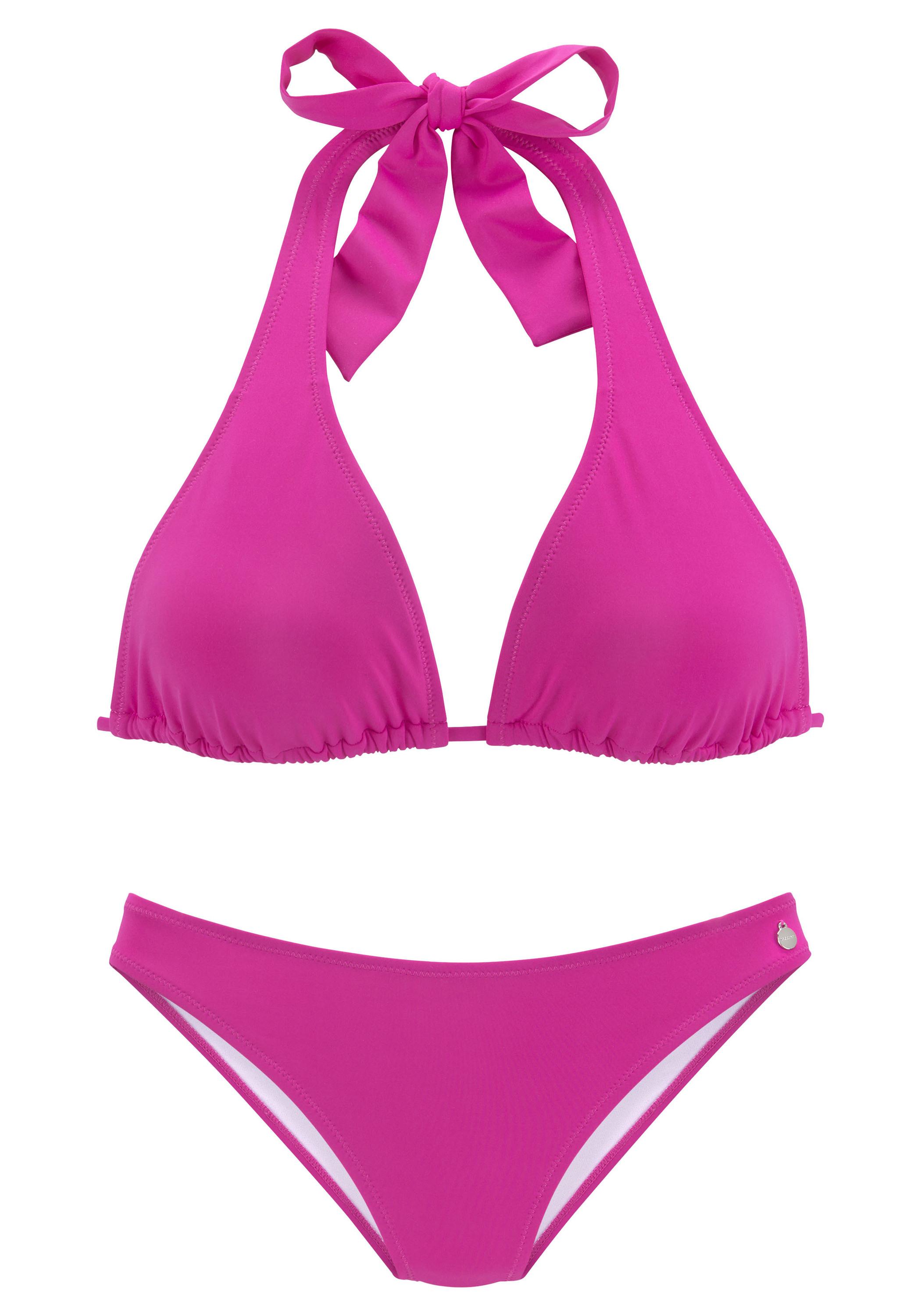 Unifarbener Triangel-Bikini von Lascana mit herausnehmbaren Softcups. Im Rücken und Nacken zu binden für eine individuelle Passform. 5 Tragevarianten möglich. Elastische Qualität mit recyceltem Polyamid.