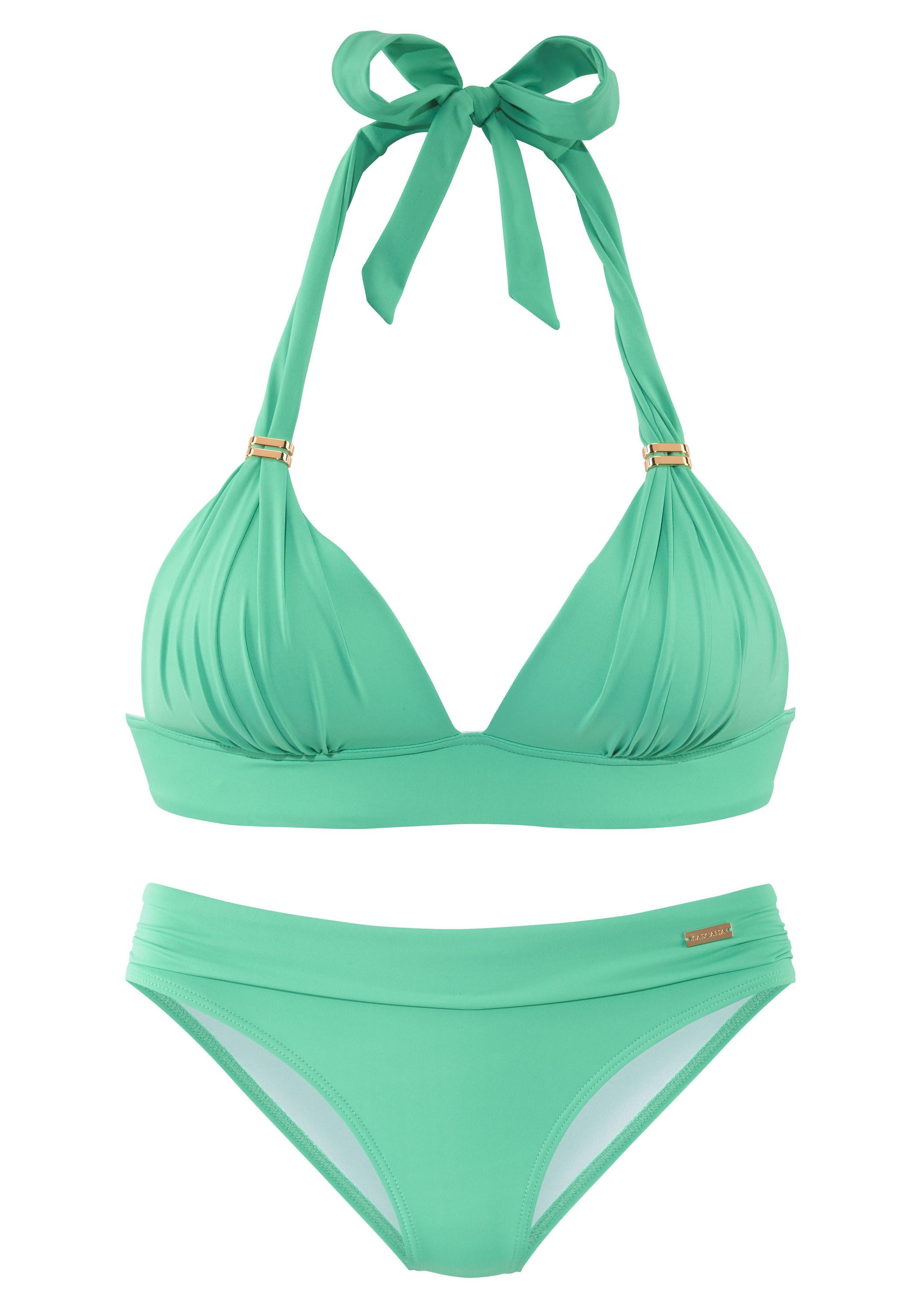 Eleganter Triangel-Bikini von Lascana mit modischen Accessoires. Neckholder-Top mit Raffungen und breitem Unterbrustband. Wattierte Cups mit herausnehmbaren Kissen für Cup A und B. Bikinihose mit Umschlagbund. Trageangenehme Qualität mit recyceltem Polyamid.