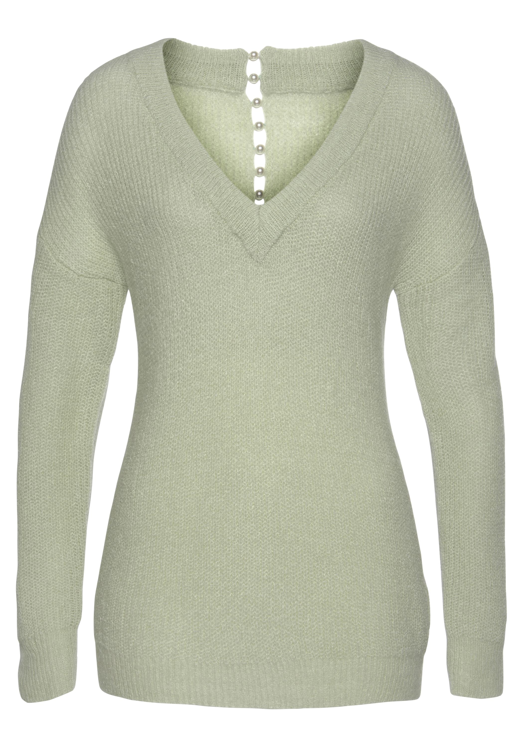 Pullover von LASCANA mit Schlitz und weißen Zierperlen im Rücken. Vorn mit V-Ausschnitt. Länge ca. 56 cm. Aus 77% Polyacryl, 19% Polyester, 4% Elasthan.