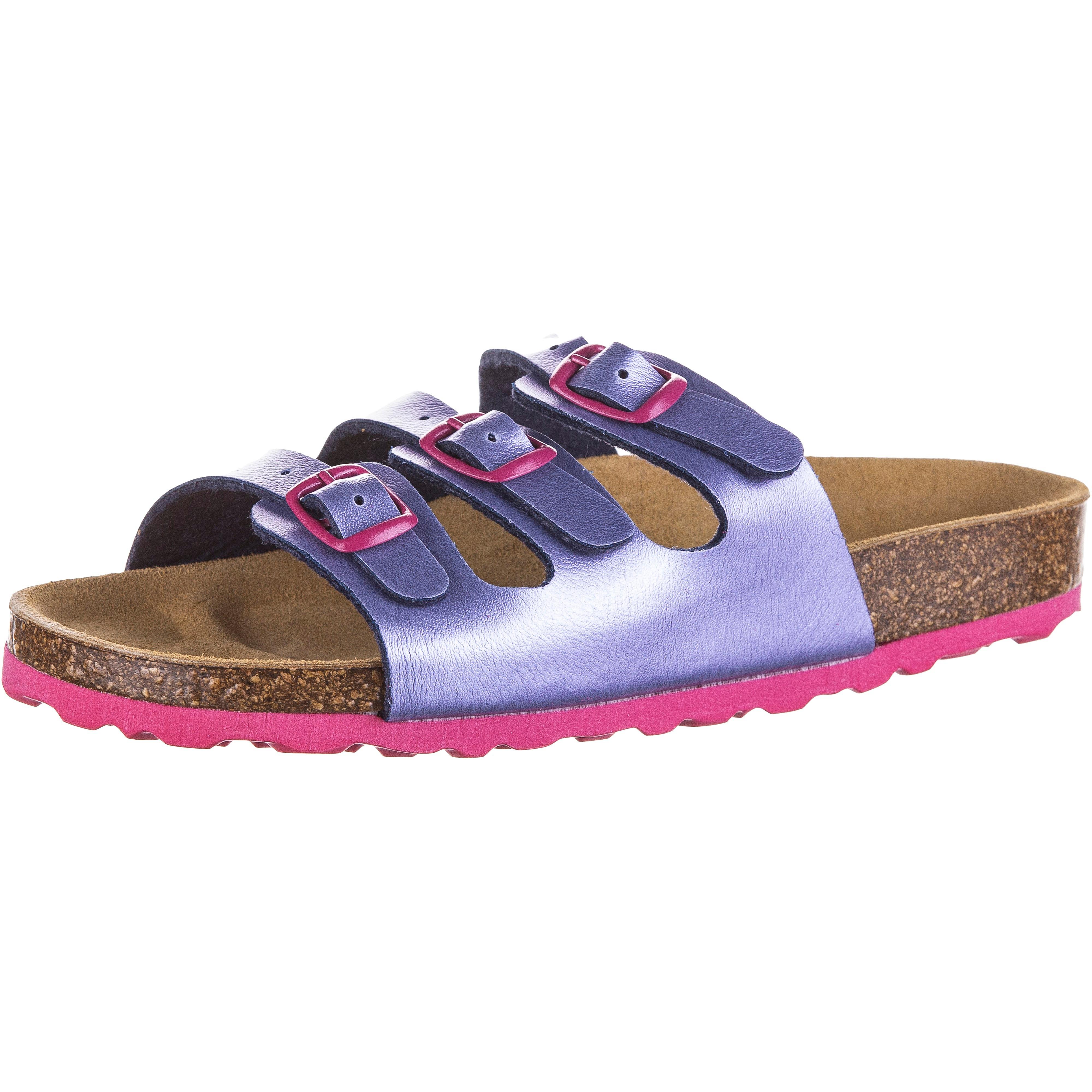 Stylishe Sandalen für Kinder, mit Lederdecksohle; shockabsorber-Funktion für ideale Dämpfung; Obermaterial aus weichem Synthetik; 3 verstellbare Schnallen auf dem Spann für beste Einstellmöglichkeiten; angenehmes Tragegefühl dank hochwertigen Kork-Naturkautschuk-Fußbett, mit überzogenem Echtleder; leicht profilierte Laufsohle aus Gummi für optimale Flexibilität.