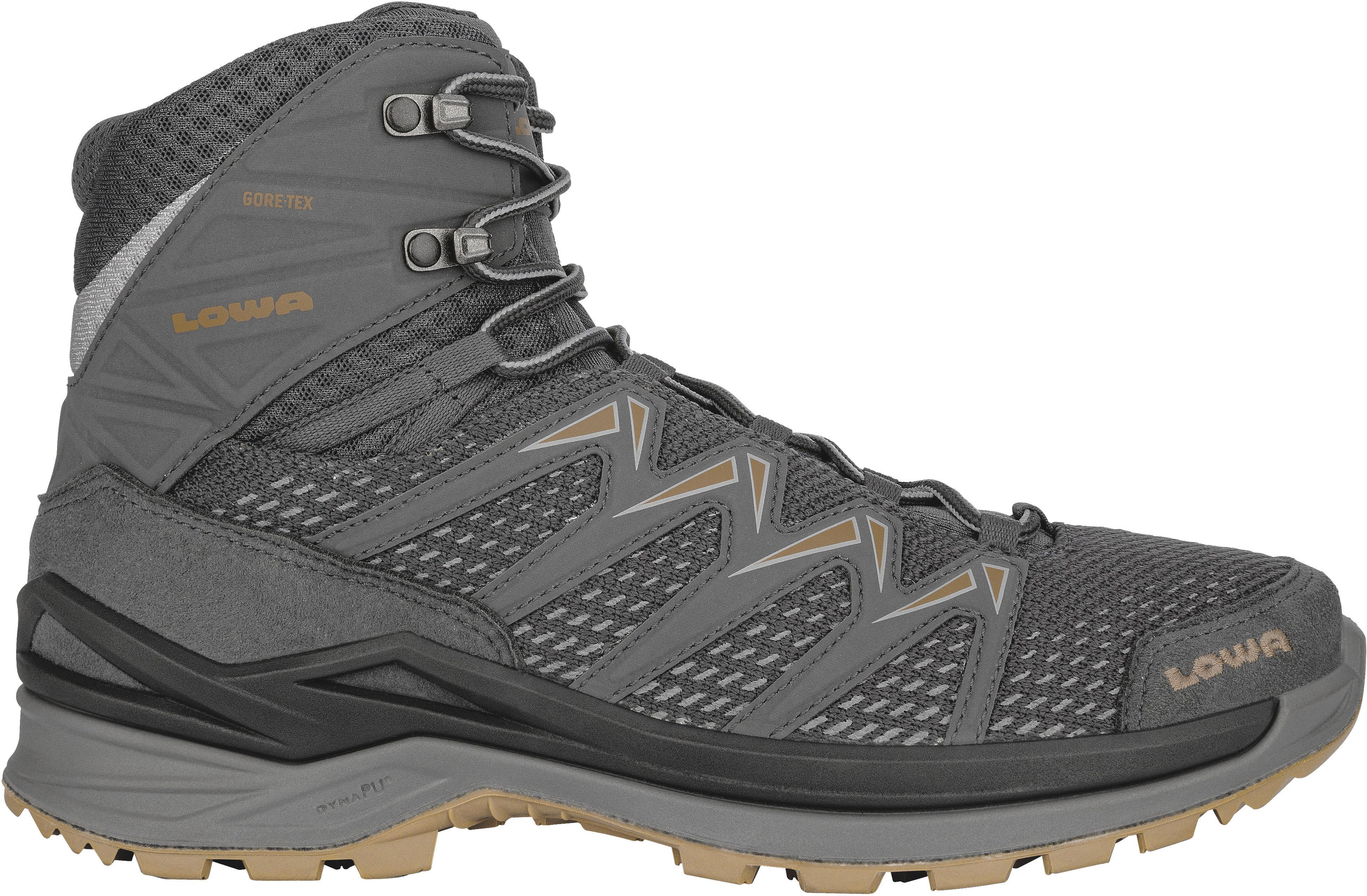 Strapazierfähige Wanderschuhe mit dauerhaft wasser- und winddichter sowie atmungsaktiver GORE-TEX Membran; Obermaterial aus fast nahtlosem Textil und Synthetik; Schnürung mit zusätzlichen Metallhaken; Zunge und Schaft weich gepolstert; geformte, herausnehmbare Einlegesohle; der Soft Stabilizer bietet eine optimale Unterstützung für sportliche Freizeitaktivitäten; mit DynaPU®-Dämpfung; hervorragender Tragekomfort durch Double Injection; optimale Unterstützung für den Geländeeinsatz durch LOWA-MONOWRAP®-Rahmen; robuste LOWA® Multi Trac® Außensohle mit starkem Profil; Gewicht: ca. 500 g /Gr. 43 (einzeln).