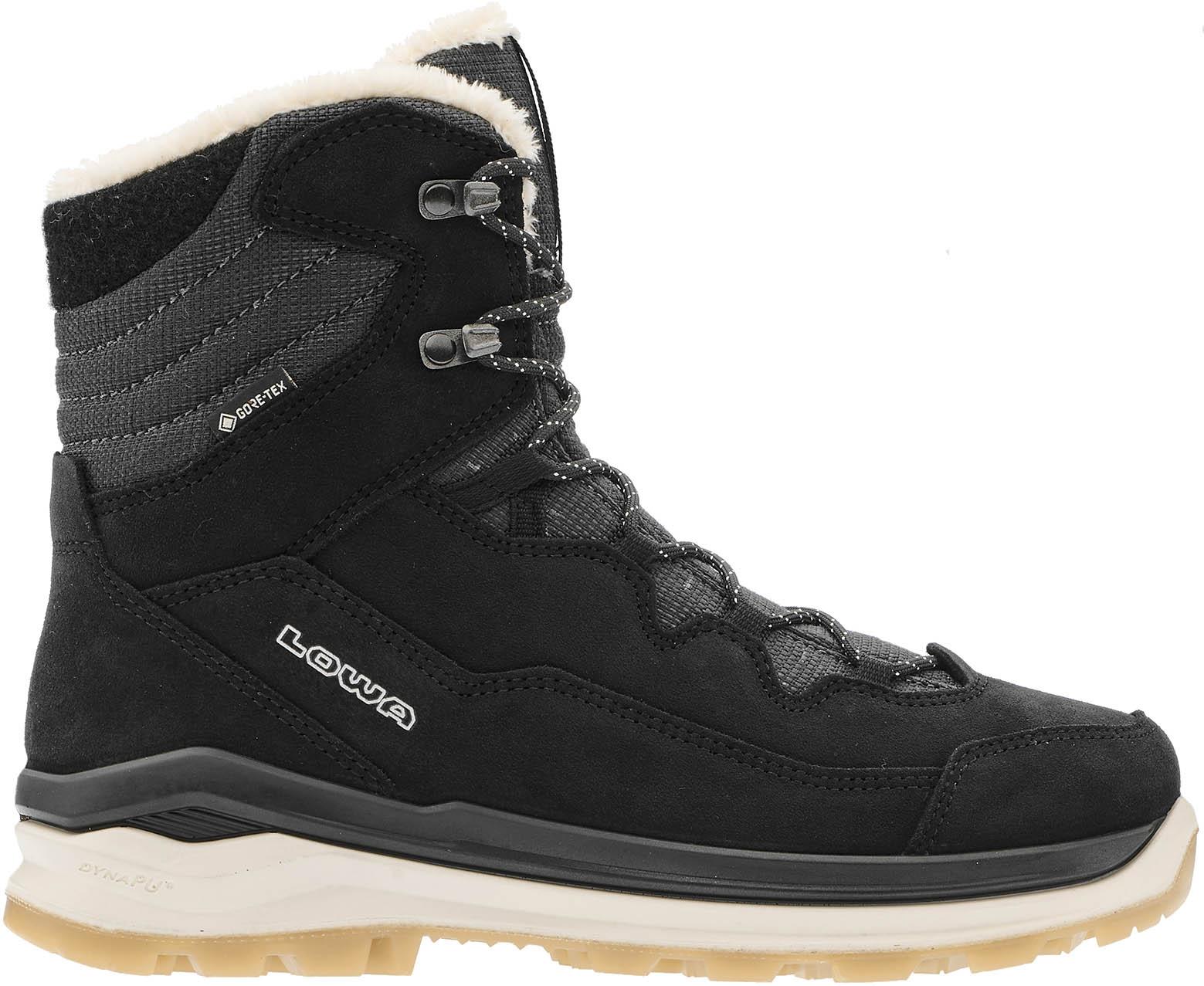 Wanderstiefel mit kompromisslos hoher Ausstattung für winterliche Wetterverhältnisse; aus hochwertigem Veloursleder mit einer robusten Zehen- und Fersenkappe für extreme Widerstandsfähigkeit; mit neugestalteter Zwischensohle mit DynaPU®-Schaum für beste Dämpfung und mit Rebound-Eigenschaften; Laufsohle aus hauseigener Gummimischung mit grobstolligem Profil für Oberflächen aus Schnee und Eis; Support Frame für mehr Halt auf unebenen Böden; moderatly stiff für ein angenehmes Abrollverhalten; Zweizonen-Schnürsystems mit überarbeiteten Haken; garantiert wasserdichte GORE-TEX Membran mit Warmfutter; Frauen-Passform.