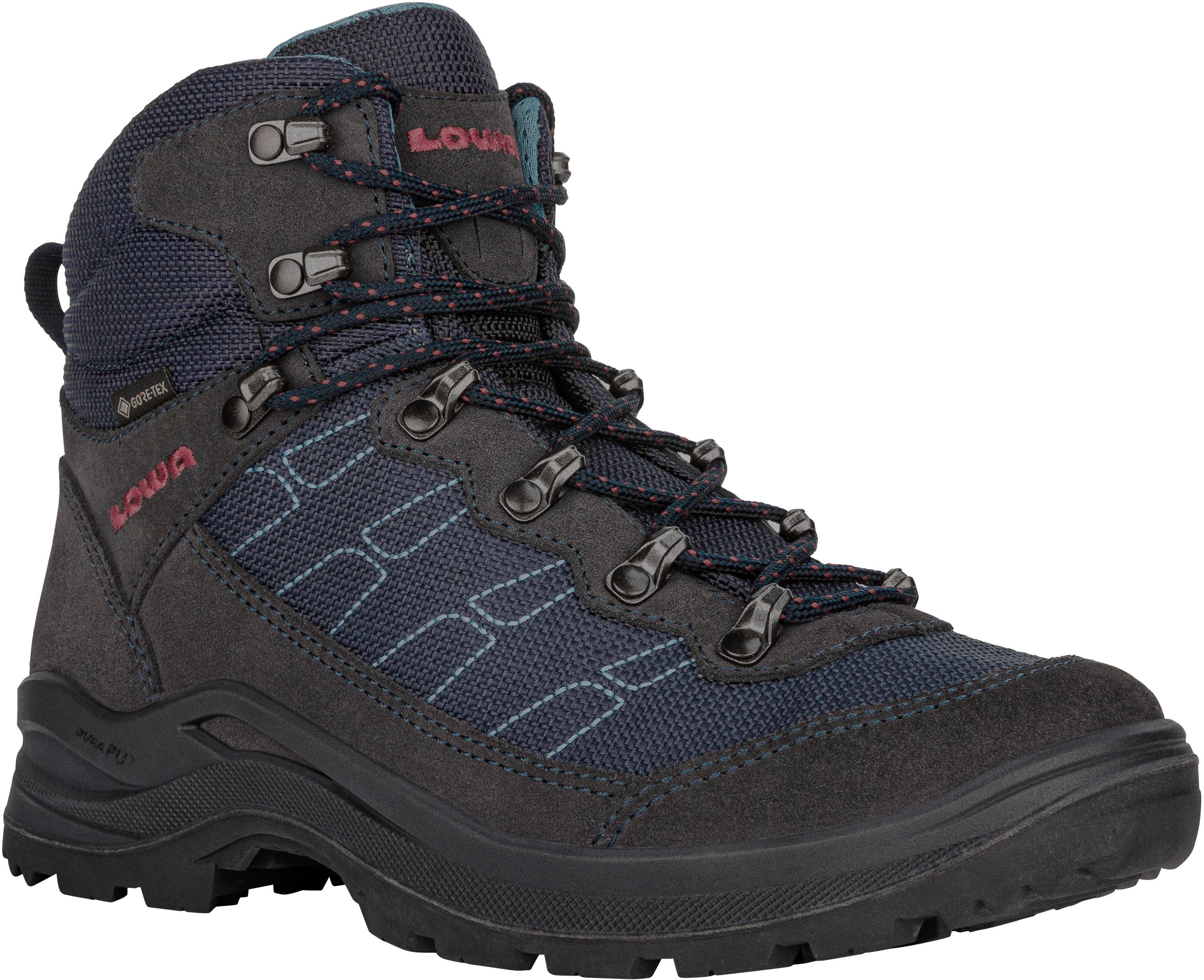 Wanderschuhe mit dauerhaft wind- und wasserdichter sowie atmungsaktiver GORE-TEX Membran; mittelhoher Schaft, speziell an die weibliche Anatomie angepasst; strapazierfähiges Obermaterial aus Veloursleder und Textil; Schnürsystem mit Metallhaken; Textilfutter; dämpfende PU-Zwischensohle mit hervorragendem Rebound-Effekt, wird per Single Injection-Verfahren direkt an den Schuh angespritzt; dreidimensionales Design der Mittelsohle mit leicht hochgezogenem Lowa-Monowrap®-Rahmen zur Unterstützung und Führung des Fußes; Lowa® Lima-Außensohle aus Gummi mit multidirektionalem Profil für hervorragende Griffigkeit in moderatem Gelände; mit ausgeprägter Absatzkante für angenehmes Bergabgehen; normale Schuhweite; Gewicht: ca. 820 g (Paar); Made in Europe.