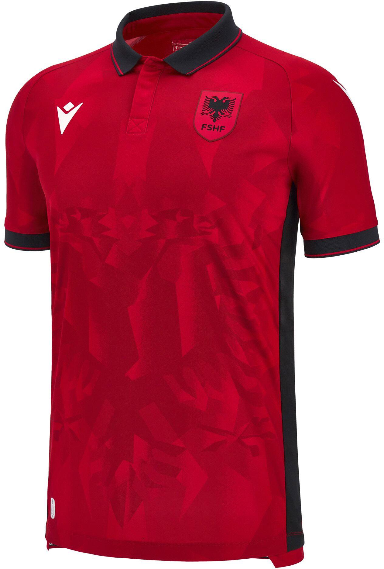 Fantrikot der albanischen Fußballnationalmannschaft; Heimspiel 2023/24; Design in Nationalfarben mit Adlerprint auf der Vorderseite; Eco Softlock-Material aus recyceltem und Global Recycle Standard zertifiziertem Polyester; Polokragen und kurze Druckknopfleiste; Mannschaftswappen und Markendetail auf der Brust; Material 100% Polyester (recycelt).