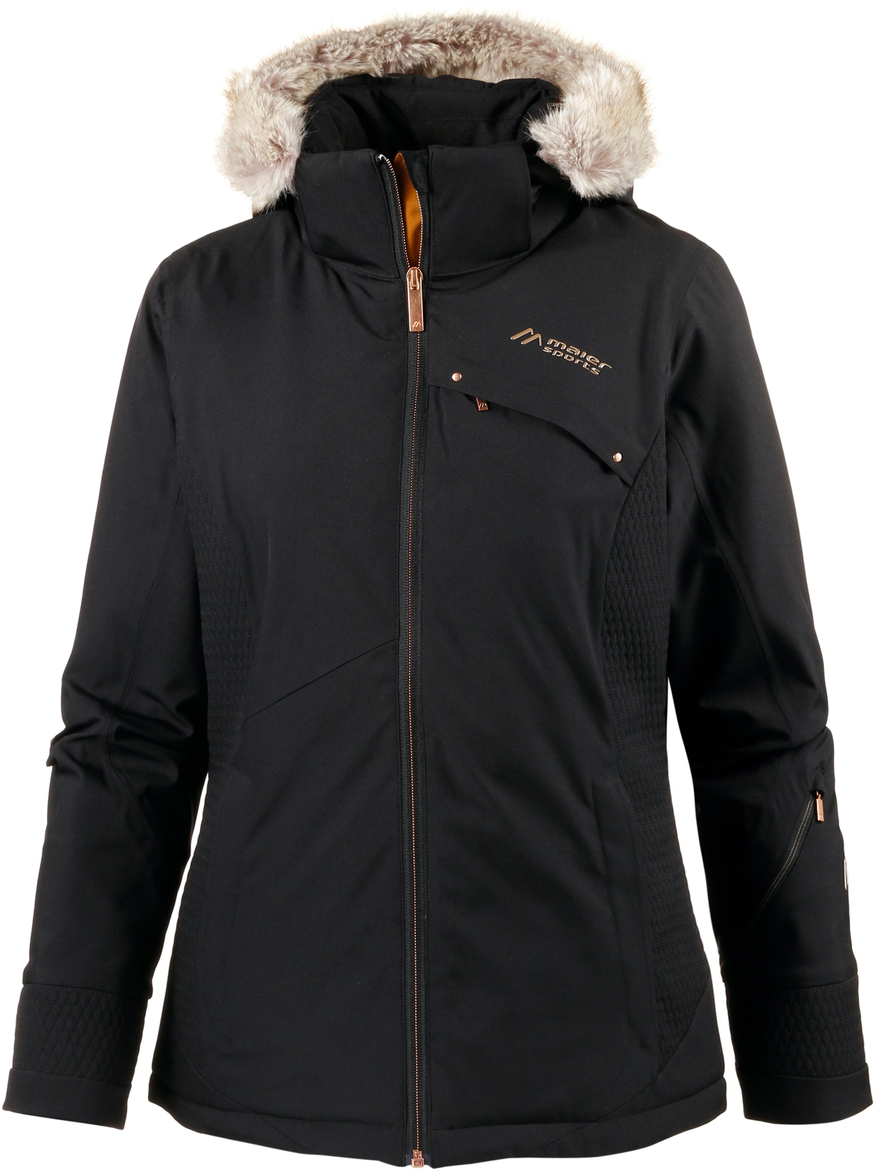 Maier Sports CATANCHU. 2-lagige Skijacke mit m'TEX-Technologie, die für eine hohe Atmungsaktivität, absolute Wasser- und Winddichtheit sorgt; das robuste Außenmaterial weist Nässe und Schmutz perfekt ab; Wassersäule 10.000 mm; weich gefütterter Stehkragen und abnehmbare Kapuze mit festem Kunstfellbesatz; unterlegter Frontreißverschluss mit Kinnschutz; gesteppte Einsätze an den Seiten und den Ärmeln; außen 1 Brusttasche, 2 Seitentaschen und 1 Skipasstasche, jeweils mit Reißverschluss; innen 1 Meshtasche und 1 weitere Reißverschlusstasche; Ärmelabschlüsse mit Cuffs und Daumenloch; integrierter Schneefang mit Antirutschgummi; mTHERM-Wattierung für eine optimale Wärmeisolation; 2-Wege-Stretch-Material schafft Bewegungsfreiheit; Bund mit Kordelzug und Stopper verstellbar; Material 100% Polyester.