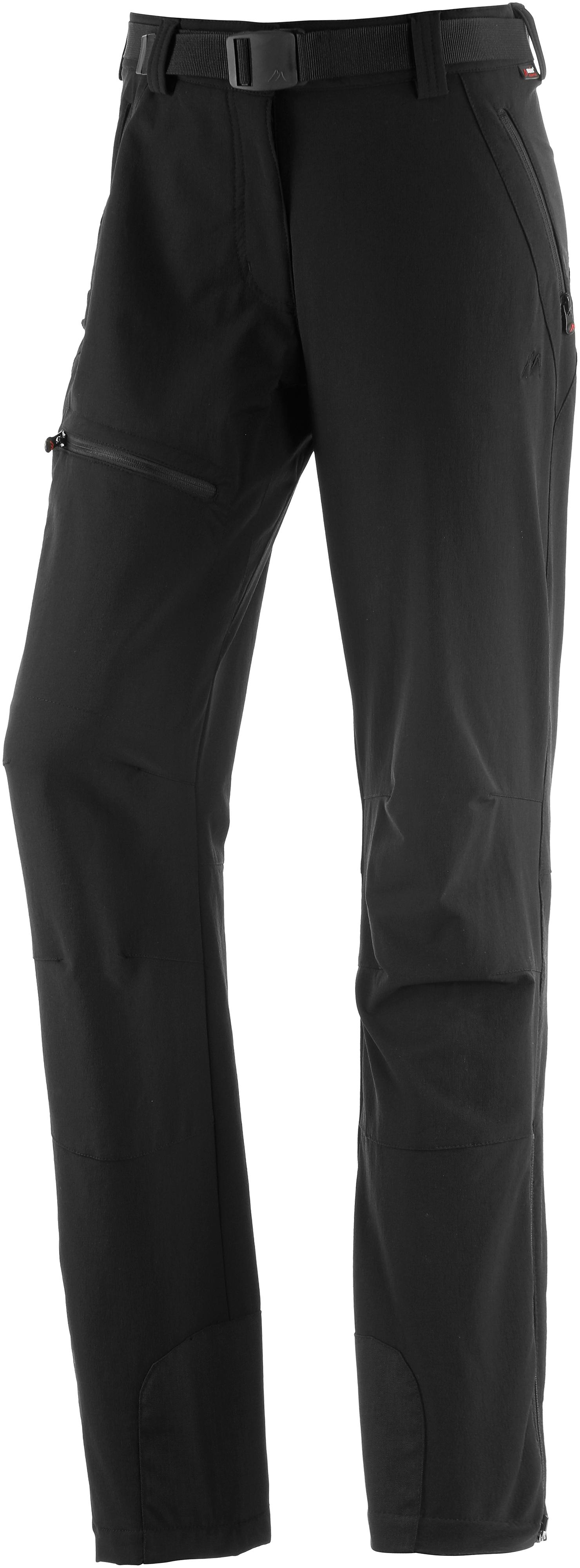 Maier Sports LANA. Strapazierfähige, bi-elastische Softshellhose - geeignet für diverse alpine Unternehmungen; elastischer Bund mit Gürtel, 2 seitliche Reißverschlusstaschen und 1 Beintasche; vorgeformter Kniebereich; Verstärkungen gegen Abrieb am Beinabschluss, Beinsaum mit Weitenregulierung; ohne PFC hergestellte Ausrüstung zum Schutz der Umwelt; 93% Polyamid, 7% Elastan.