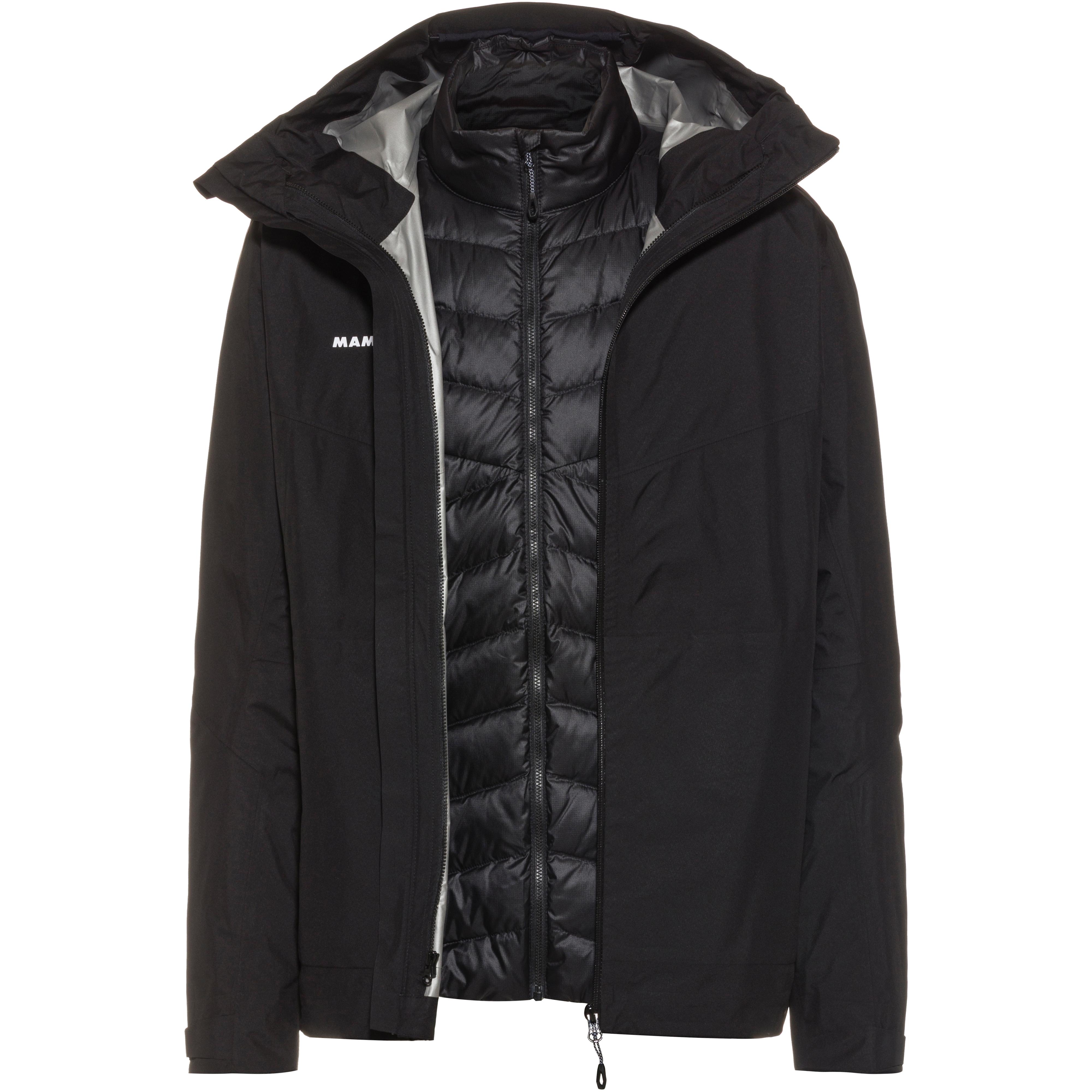 Nach umweltfreundlichem bluesign® Standard produzierte Doppeljacke; Außenjacke aus leichtem Softshellgewebe, mit dauerhaft wasser- und winddichter sowie atmungsaktiver GORE-TEX Membran; versiegelte Nähte; geräumige Kapuze; Kragen mit Kinnschutz; die Raglanärmel sorgen für optimale Bewegungsfreiheit; weitenregulierbare Armabschlüsse; hinterlegter Frontreißverschluss; Belüftungsreißverschlüsse in den Seiten; verdeckte Seitentaschen mit Reißverschlüssen; verlängerte Zippbändchen; Stopper im Bund; Innenjacke aus strapazierfähigem, winddichtem und äußerst atmungsaktivem Ripstop-Pertex® Quantum Gewebe, mit wasserabweisender DWR-Beschichtung; die Hybrid Isolation aus Daunen- und Federn sowie funktioneller Oti™-Element Füllung, macht die Jacke besonders wärmeisolierend; Stehkragen mit Kinnschutz; verdeckte Seitentaschen mit Reißverschlüssen; enthält nichttextile Teile tierischen Ursprungs; Material I 100% Polyester, Material II 100% Polyamid, Material III 90% Entendaunen, 10% Entenfedern; Material IV 100% Polytetrafluorethylen.