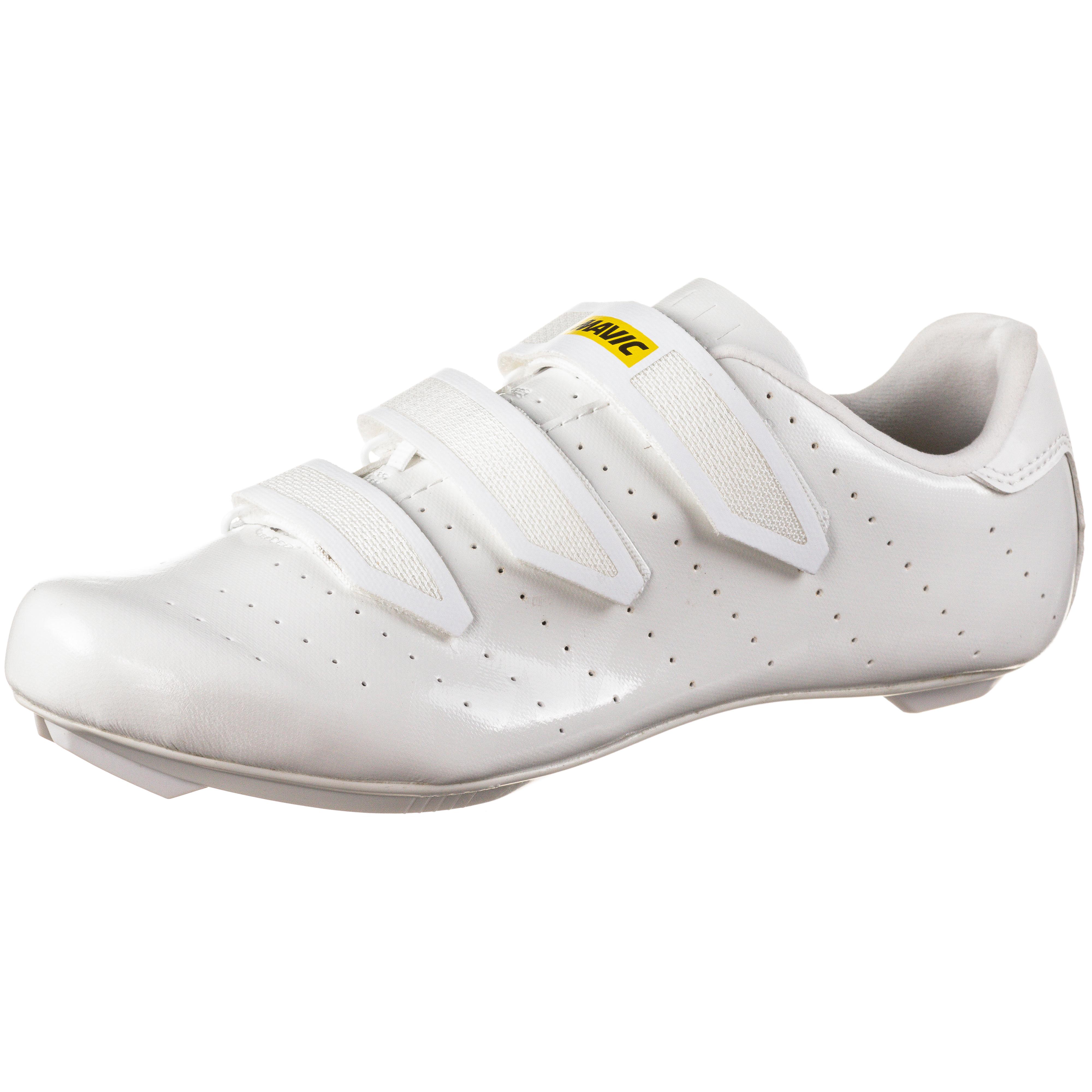 Mavic COSMIC. Fahrradschuhe aus wetterfesten sowie strapazierfähigem Obermaterial, mit diversen Perforationen, für eine angenehme Ventilation; 3 Klettverschlüsse, für eine optimal personalisierbare Anpassung an den Fuß; schützende Zehn- und Fersenkappe; gerundete, geräumig geschnittene Zehenbox; herausnehmbare und feuchtigkeitsregulierende OrthoLite®-Einlegesohle; leicht gepolsterter Schaftbereich; Gewicht: ca. 225 g (Gr. 38/ einzeln); Obermaterial aus Synthetik; Innensohle aus Textil; Energy Comp Außensohle aus Polyamid und Glasfaser, mit anatomischen Leisten.