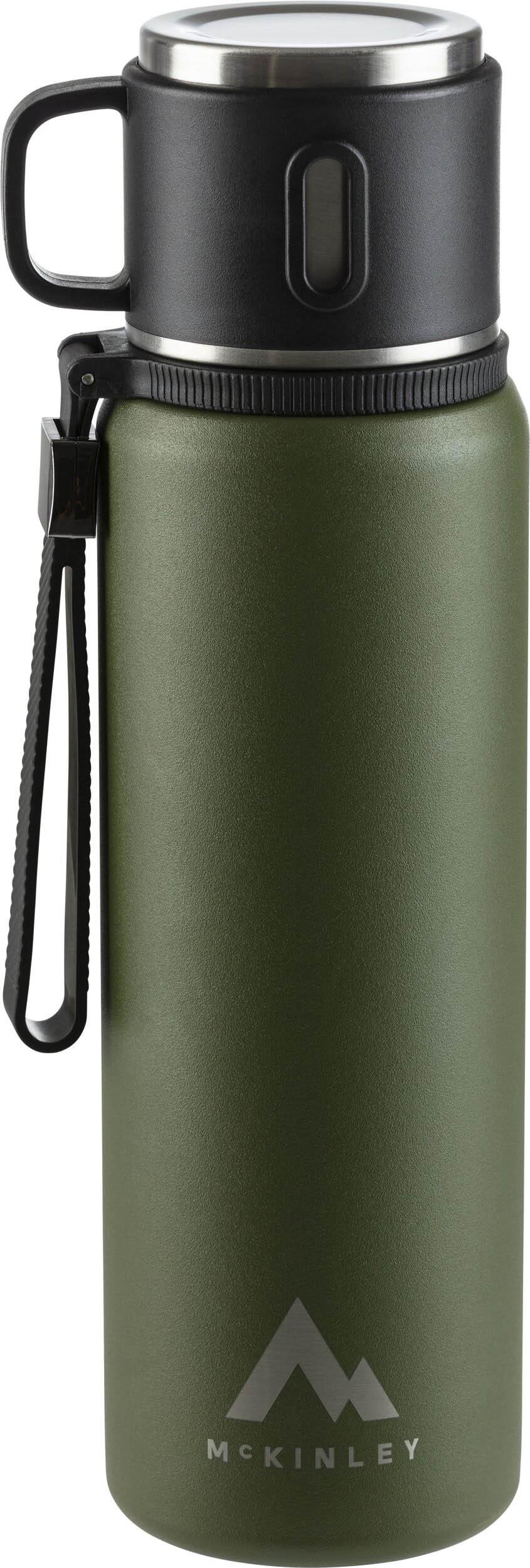 Hochwertige Thermosflasche mit praktischem Henkel-Becher; doppelwandige Vakuumisolierung aus Edelstahl; hält Getränke bis zu 24 h kalt oder bis zu 10 h warm; integriertes Verschlusssystem mit Druckknopf; Transportschlaufe am Flaschenhals; inklusive Siebeinsatz für Tee; matt veredelte Außenseite mit Labelprint; leicht zu reinigen; 880 ml Fassungsvermögen; Gewicht: ca. 446 g.