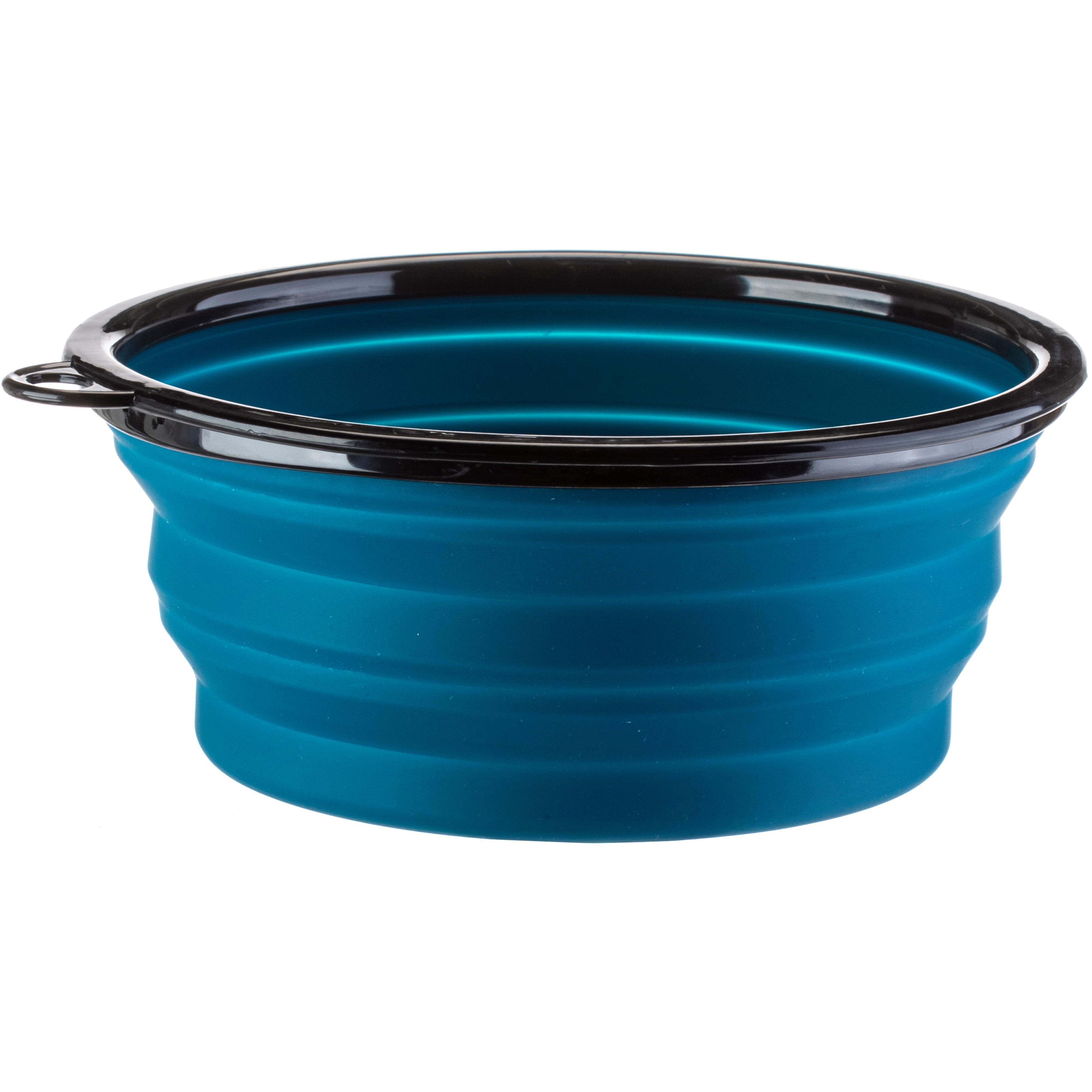 Zusammenfaltbare Campingschüssel, aus hitzeresistentem Silikon; Durchmesser: ca. 17,5 cm; Volumen: ca. 1000 ml; Gewicht: ca. 135 g.
