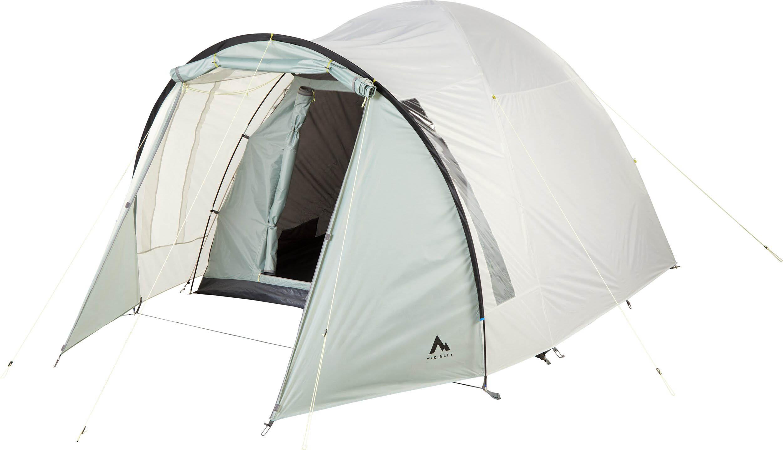 Geräumiges Familien-Kuppelzelt für bis zu 4 Personen mit 1 Schlafkabine; wasserdichtes Außenmaterial mit 2.000 mm Wassersäule; besonders strapazierfähiger Boden mit 3.000 mm Wassersäule; stabiles Gestänge aus Fiberglas für einen sicheren Stand; Gewicht: ca. 7 kg; Außenmaße: ca. 370 x 270 x 195 cm; Innenmaße: ca. 210 x 260 x 190 cm; Packmaß: ca. 60 x 22 x 22 cm.