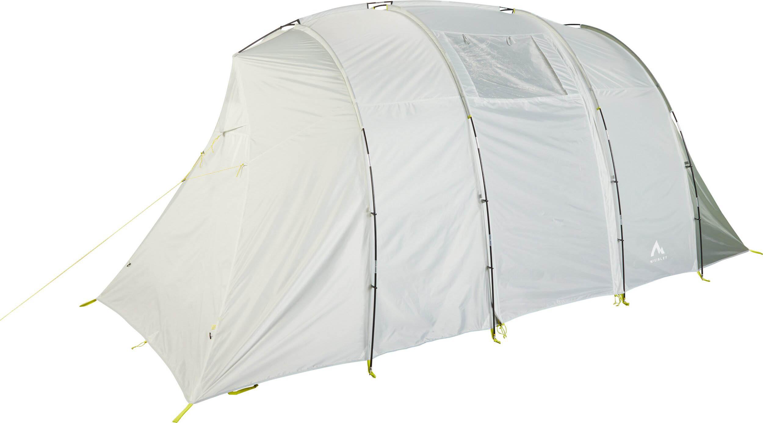 Familien-Kuppelzelt für 6 Personen; 2 Eingänge für maximale Flexibilität; 2 gegenüberliegende Schlafkabinen; robuste Konstruktion mit 11 mm und 9,5 mm Fiberglasgestänge; Außenmaterial aus Polyester mit 2.000 mm Wassersäule; widerstandsfähiger Boden aus Polyethylen mit 3.000 mm Wassersäule; Außenmaße: ca. 500 x 250 x 210 cm; Innenmaße: ca. 210 x 185 x 190 cm; Packmaß: ca. 70 x 20 cm; Gewicht: ca. 12,7 kg.