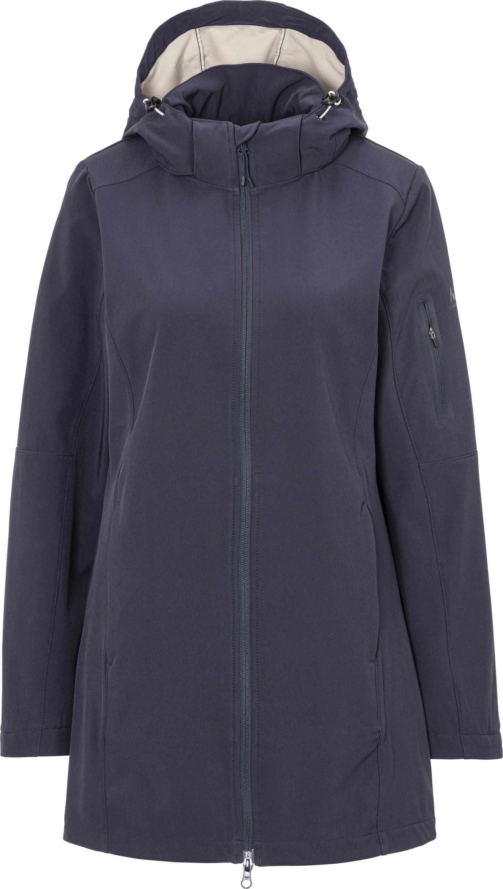 Langer Softshellmantel mit hohem Kragen; verstellbare und abnehmbare Kapuze; durchgehender 2-Wege-Frontreißverschluss mit Kinnschutz; 2 Seitentaschen und eine Tasche am Oberarm, jeweils mit Reißverschluss; Material 100% Polyester.