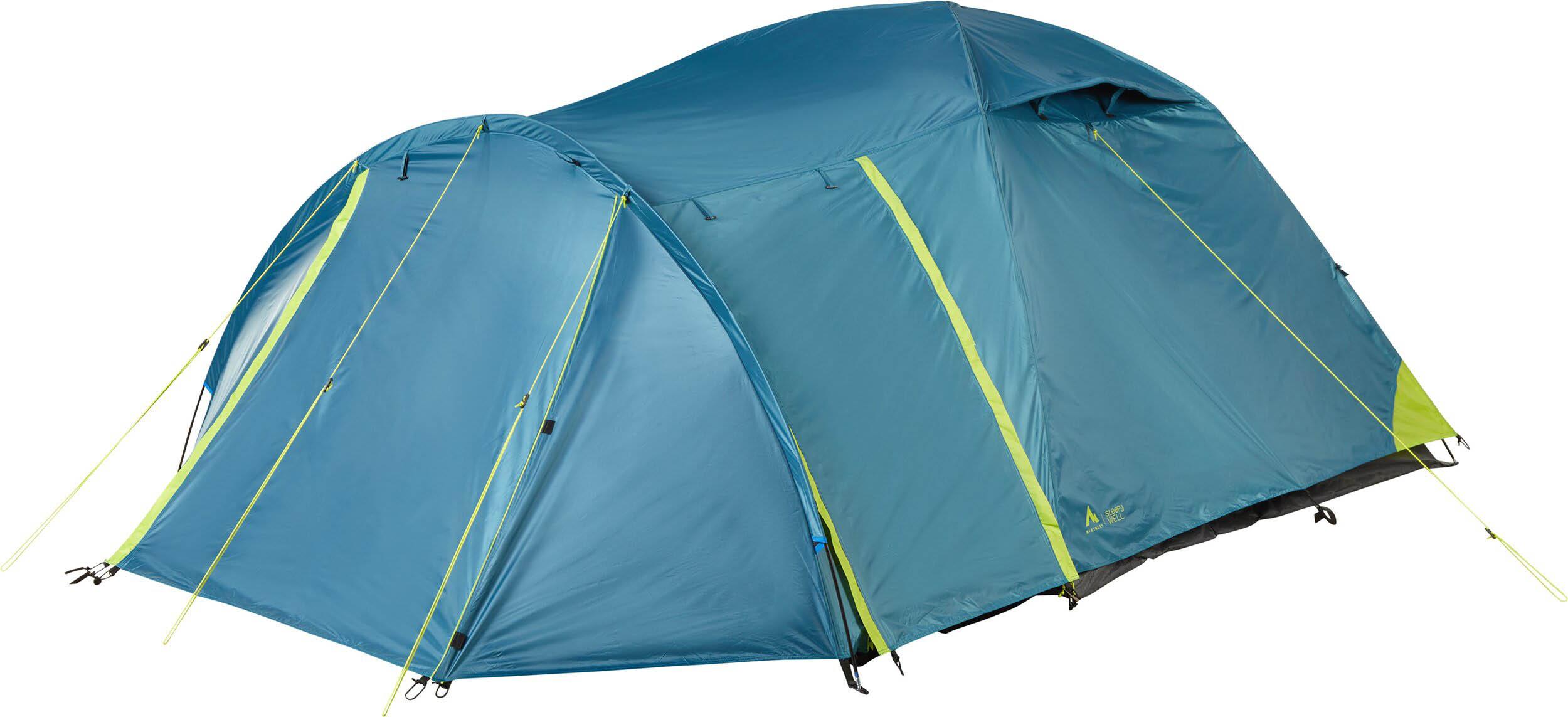 Kuppelzelt für 4 Personen; doppelwandige Konstruktion; innovative Sleepwell-Technologie mit abgedunkeltem Innenraum; 3 Eingänge und 1 Apsis; Wassersäule Außenzelt: 2.000 mm; Wassersäule Boden: 3.000 mm; 7,9 mm starkes Fiberglasgestänge; Maße Außenzelt: ca. 415 x 250 x 135 cm; Maße Innenzelt: ca. 210 x 240 x 130 cm; Gewicht: ca. 5,8 kg.