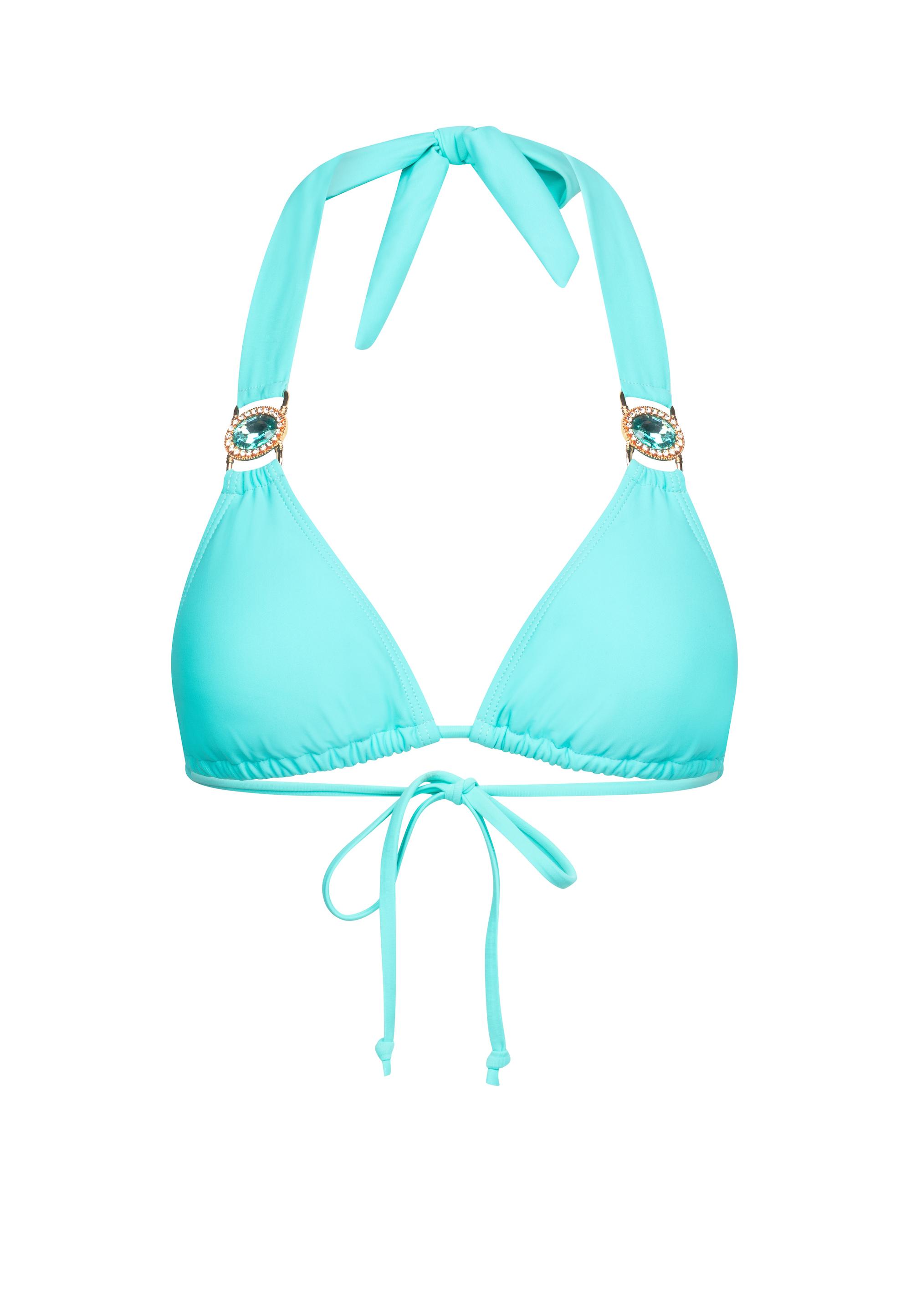 Das Bikinioberteil von Moda Minx überzeugt mit einem femininen Triangle-Schnitt, der sich durch Bindebänder im Nacken und Rücken individuell anpassen lässt. Ein stilvoller Steinbesatz an beiden Trägern setzt funkelnde Akzente und verleiht dem klassischen Design eine glamouröse Note. Ideal für entspannte Stunden am Pool oder aktive Momente im Wasser – dieses Oberteil ist die perfekte Wahl für Sonnenliebhaberinnen, die Stil und Komfort kombinieren möchten.