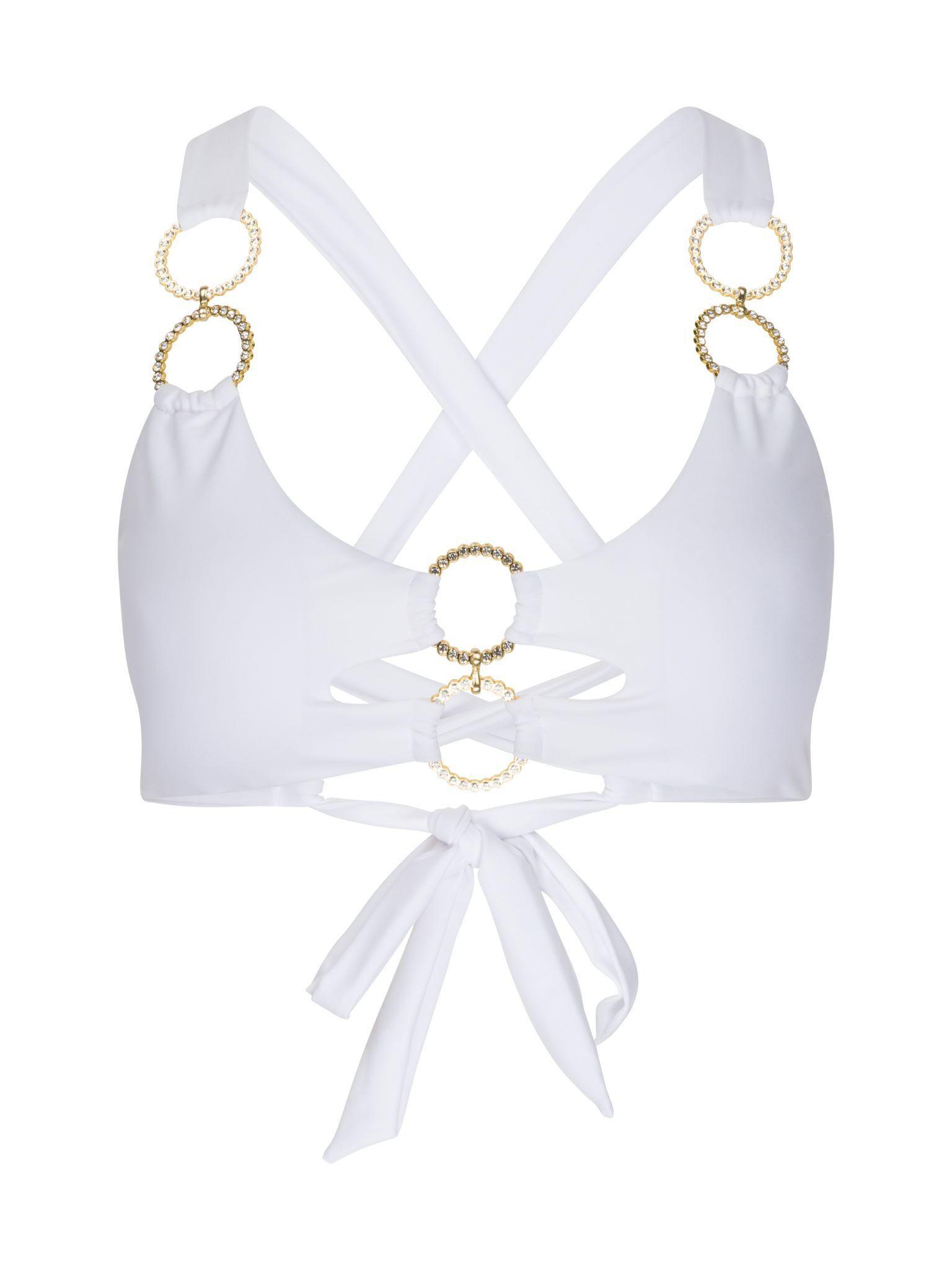 Das super modische Bikinioberteil von Moda Minx strahlt mit der Sonne um die Wette! Durch die wunderschönen, mit kleinen Steinen besetzten Ringen ist dieses Bikinitop ein echter Hingucker in der Sommerzeit. Abgerundet wird die tolle Optik durch eine gekreuzte Schnürung im Rücken, wodurch sich das Bikinioberteil schmeichelnd an den Körper anpasst. Somit ist es nicht nur perfekt für den Strandurlaub, sondern auch für die Badezeit am See oder im Schwimmbad geeignet. Das Bikini-Oberteil wird hinten gebunden. Um den Look gekonnt abzurunden, kombinieren Sie das passende Unterteil dazu.
