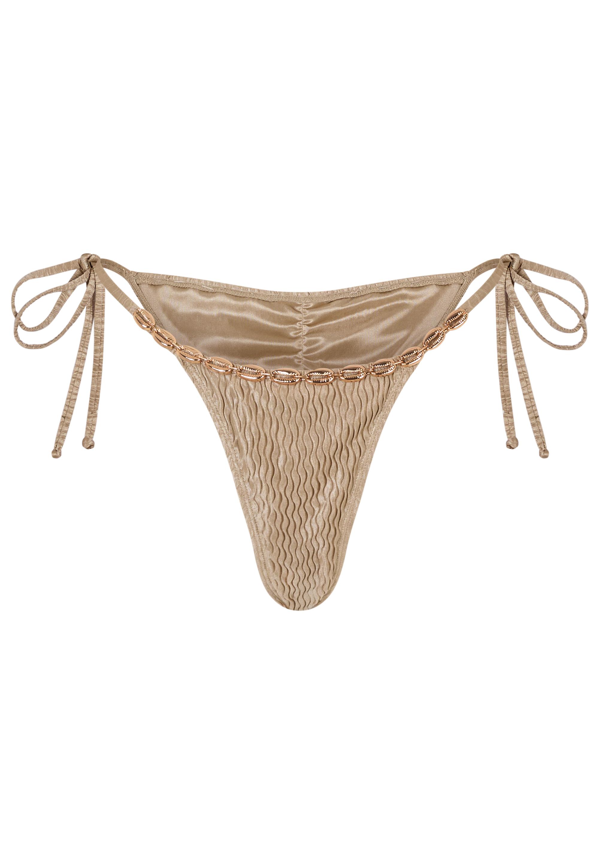 Setze ein sommerliches Statement mit der Bikinihose von Moda Minx. Der verführerische Brazilian-Schnitt betont deine Figur, während die seitlichen Bindebänder für eine individuelle Passform sorgen. Highlight des Designs sind die aufwendig gearbeiteten Muschel-Elemente, die der Hose einen charmanten Boho-Touch verleihen. Das weiche Material sorgt für angenehmen Tragekomfort – perfekt für stilbewusste Sonnenanbeterinnen.