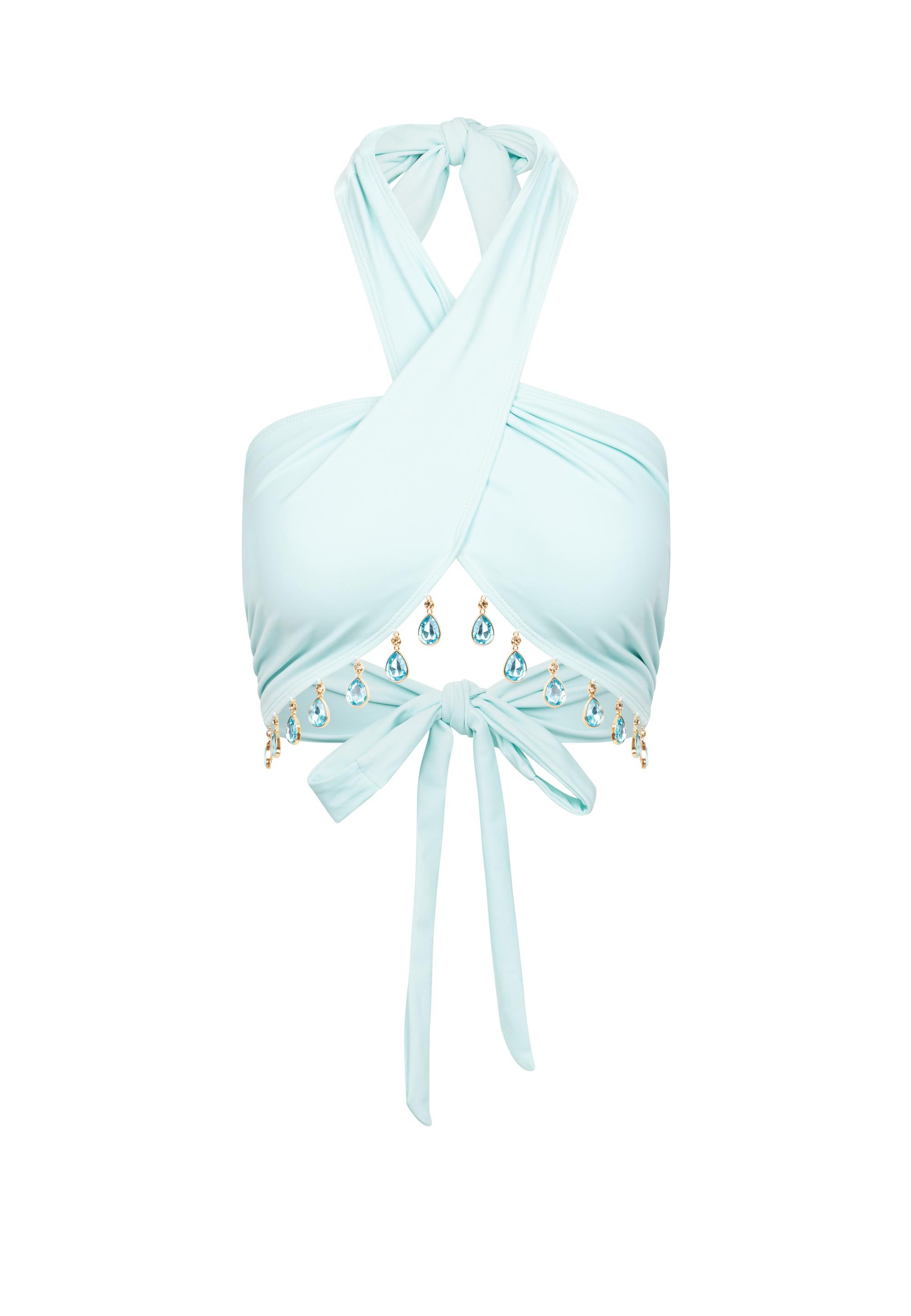 Das Bikinioberteil von Moda Minx kombiniert modisches Design mit einem einzigartigen Schnitt – perfekt für Sonnenliebhaberinnen. Das besondere Cross-Over-Design sorgt für einen aufregenden Look: Die Träger überkreuzen sich vorne und bilden im Nacken eine feste Schlaufe, durch die der Kopf geführt wird. So entsteht ein moderner, sicherer Sitz, bei dem Bauch und Brust gekonnt in Szene gesetzt werden. Ein weiteres Highlight sind die edlen Schmuckelemente, die als funkelnde Details die Blicke auf sich ziehen und dem Bikinioberteil eine exklusive Note verleihen. Hergestellt aus angenehmem, hochwertigem Material, eignet sich das Oberteil ideal für entspannte Stunden am Pool oder ausgiebige Sonnenbäder am Strand.