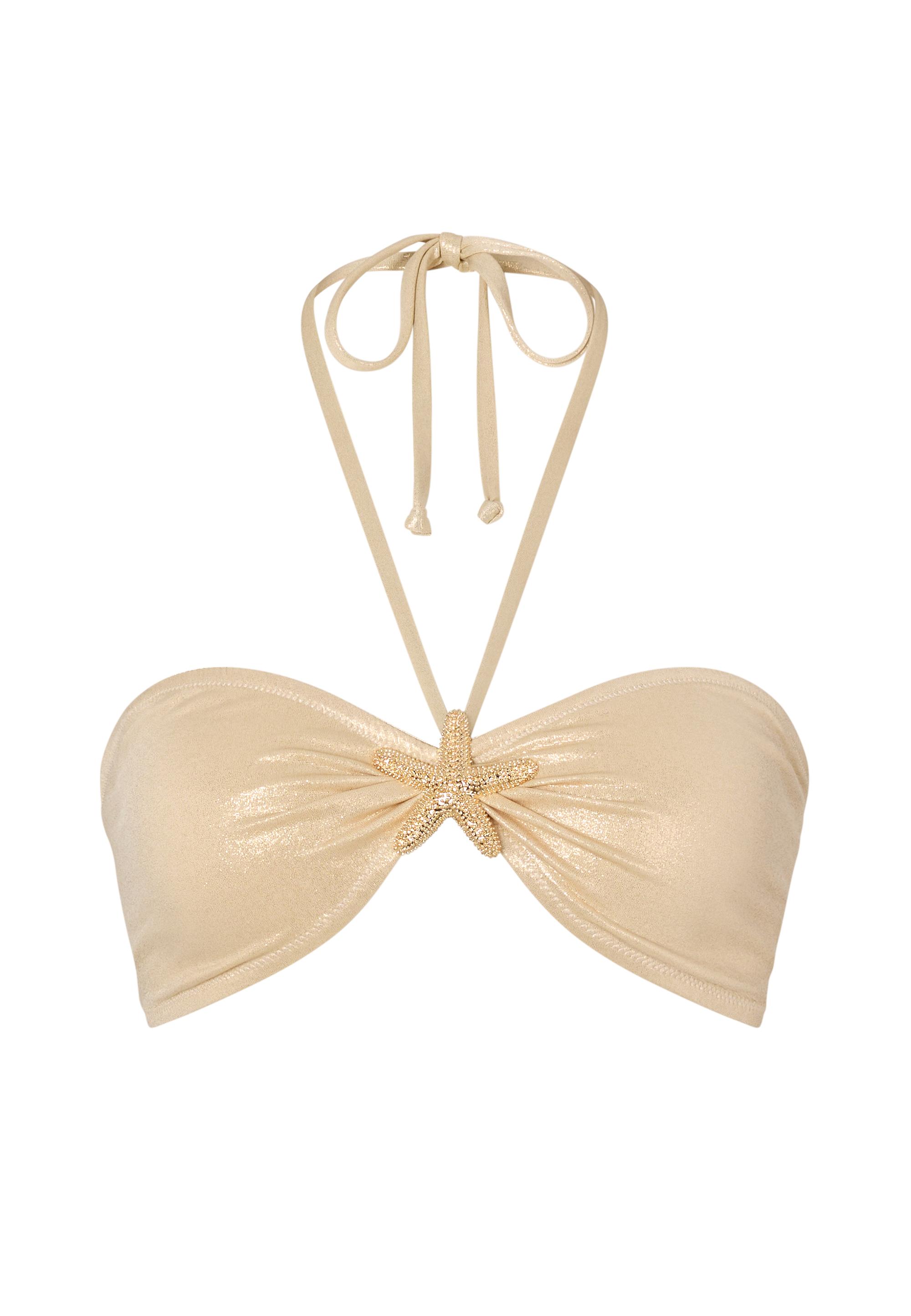 Mit dem Bandeau-Bikinioberteil von Moda Minx setzt du auf einen eleganten Beach-Look! Gefertigt aus edlem Glitzerstoff, verleiht dieses Oberteil deinem Look einen schimmernden Auftritt in der Sonne. Das funkelnde Seestern-Element in der Mitte sorgt für einen maritimen Eyecatcher, während die Nackenhalterung sicheren Halt bietet und zugleich einen femininen Akzent setzt. Ideal für stilvolle Sommertage am Pool oder Strand – für alle, die auffallen möchten.
