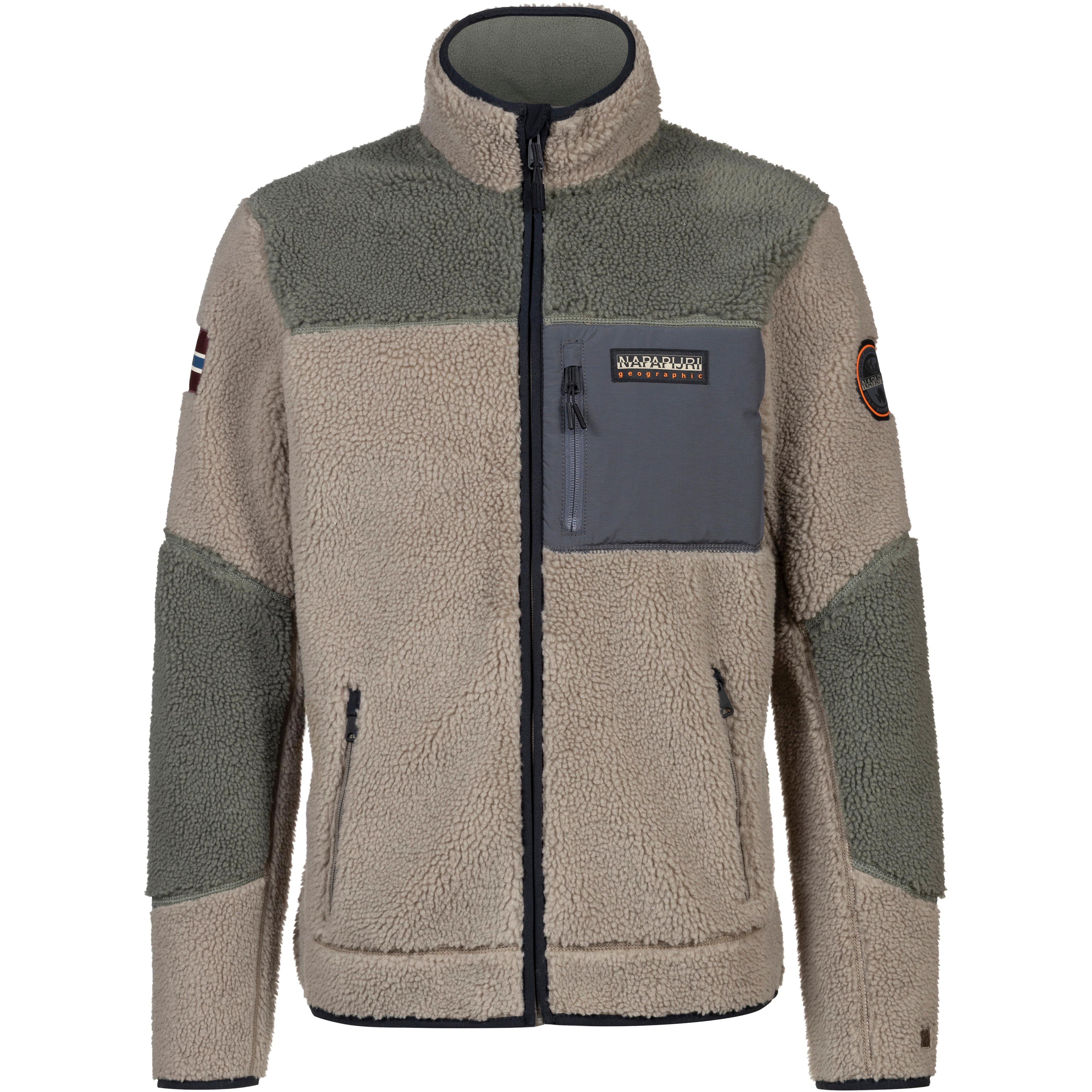 Fleecejacke aus wärmendem Sherpa-Fleece; mittelhoher Stehkragen; durchgehender Reißverschluss mit Kinnschutz; 1 Brusttasche und 2 seitliche Eingrifftaschen mit Reißverschluss; Logodetail; Meshfutter; normale Passform; mit Recyclingmaterial hergestellt; Material 100% Polyester.