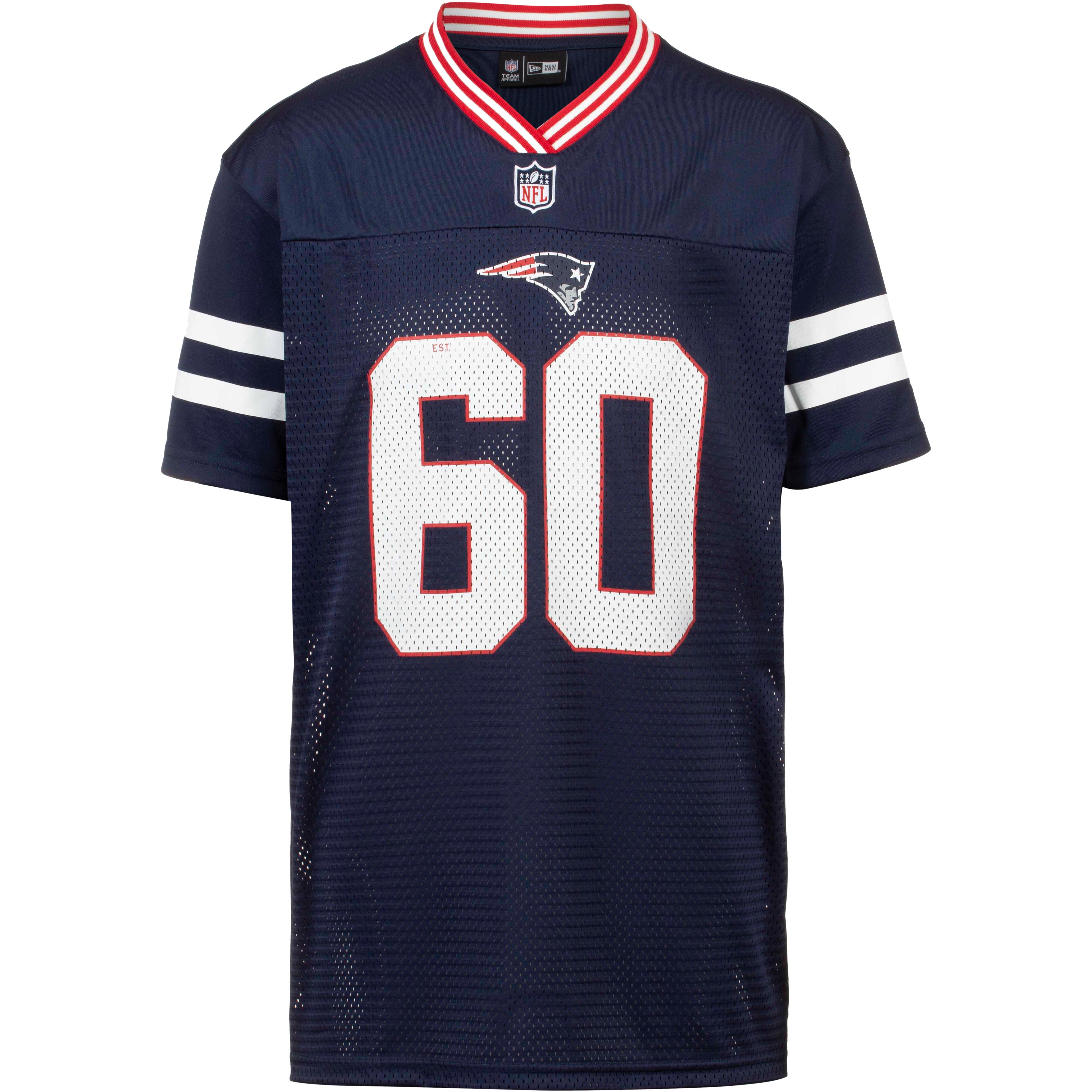Football-Fan-Trikot der New England Patriots; V-Ausschnitt mit gestreiften Rippbündchen; NFL-Badge; Spielernummer und Logo auf der Vorderseite; kurze Ärmel mit Streifen; luftiges Mesh-Material; Oversized-Passform; Material 100% Polyester.