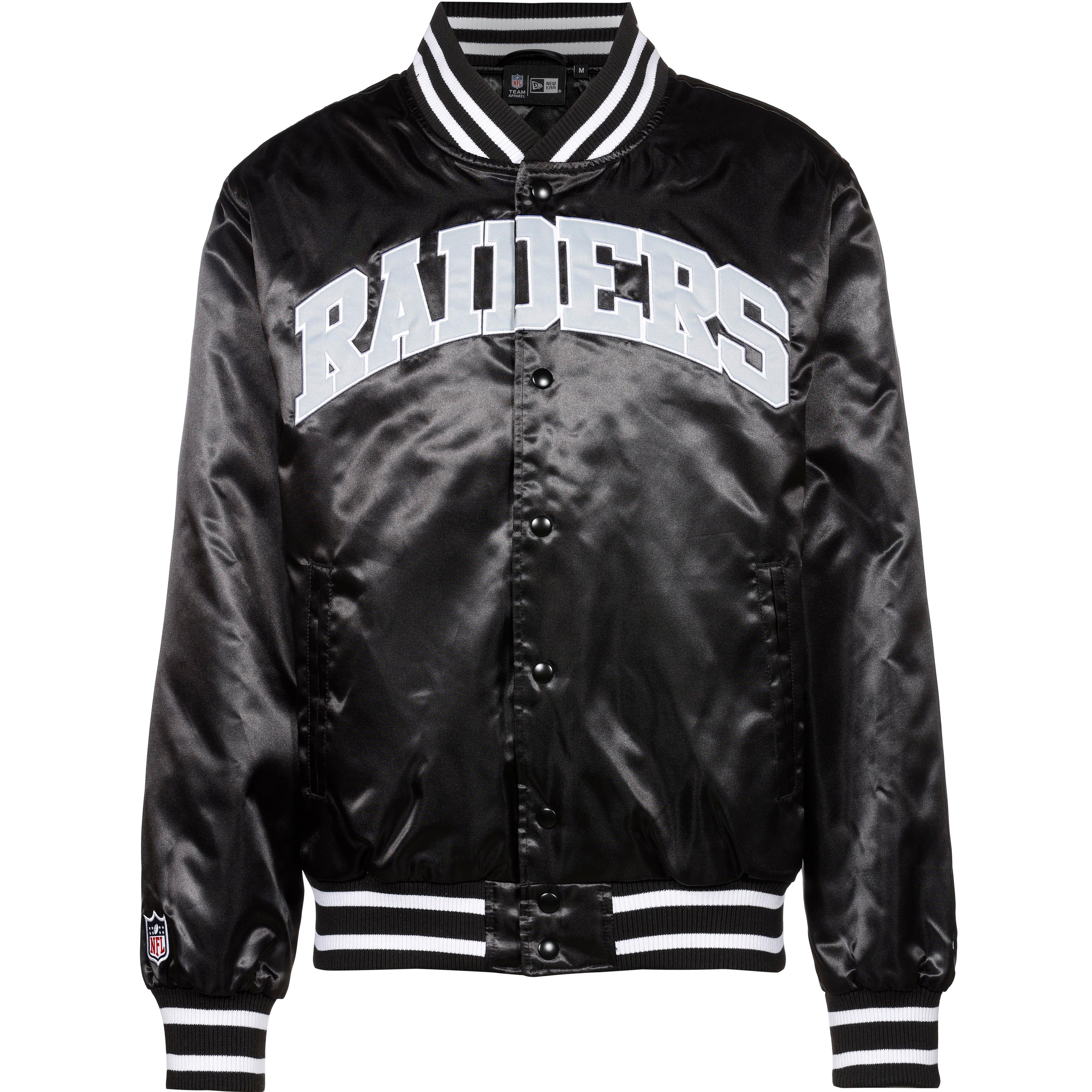 Wattierte Bomberjacke im Design der American Football Mannschaft Las Vegas Raiders mit großem Logoprint auf der Rückseite; glänzendes Obermaterial; Stehkragen und Bündchen mit Streifen und Ripp-Struktur; durchgehende Druckknopfleiste; 2 seitliche Eingrifftaschen; Material 100% Polyester.