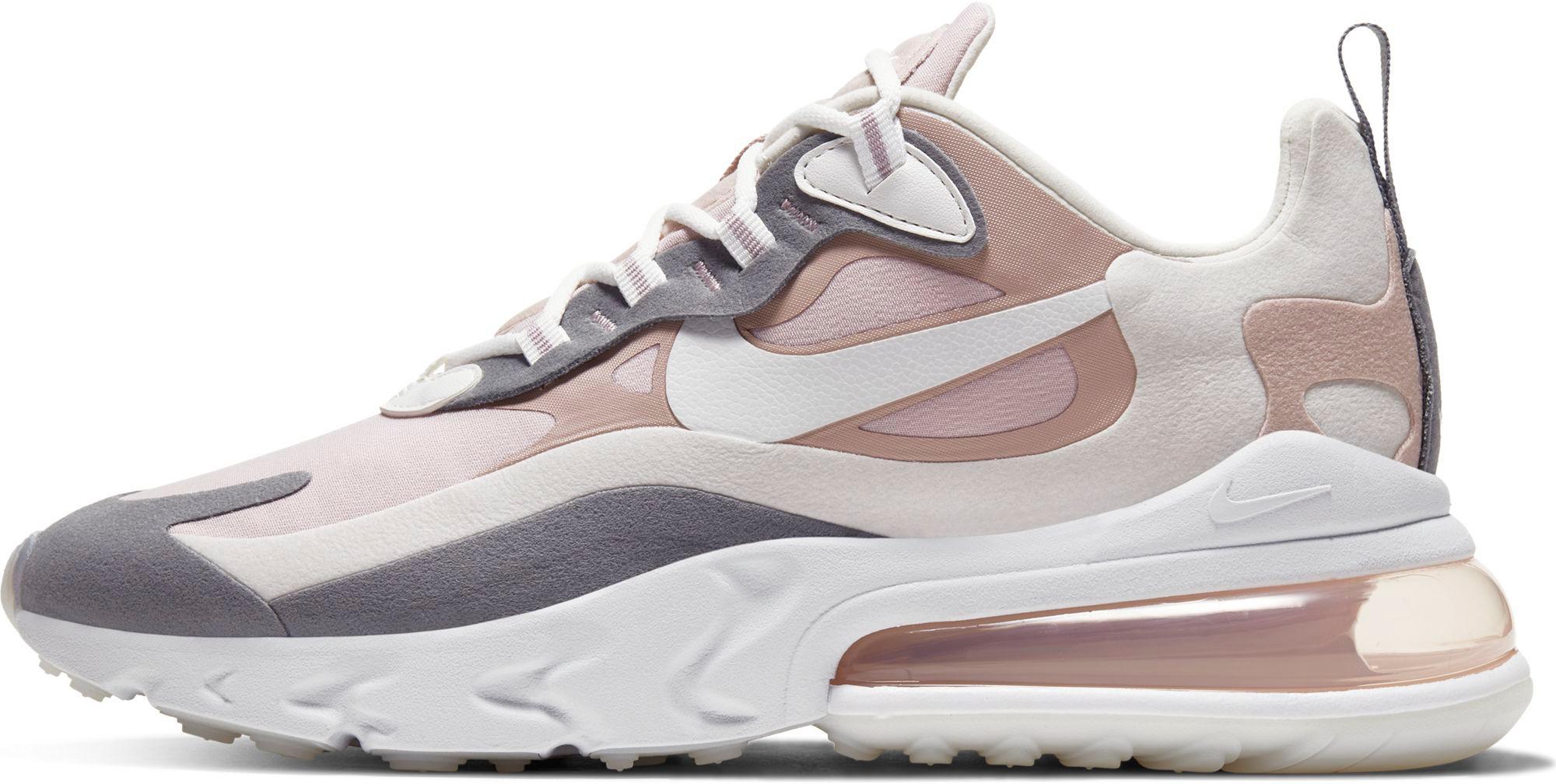 Nike AIR MAX 270 REACT. Stylishe Sneaker mit dämpfender React-Mittelsohle; Schnürung mit seitlichen Zugbändern für eine optimal, personalisierbare Anpassung an den Fuß; stabilisierende Overlays; Zuglasche zum leichteren An- und Ausziehen; Obermaterial aus Textil und Synthetik; Innensohle aus Textil; abriebfeste Außensohle.