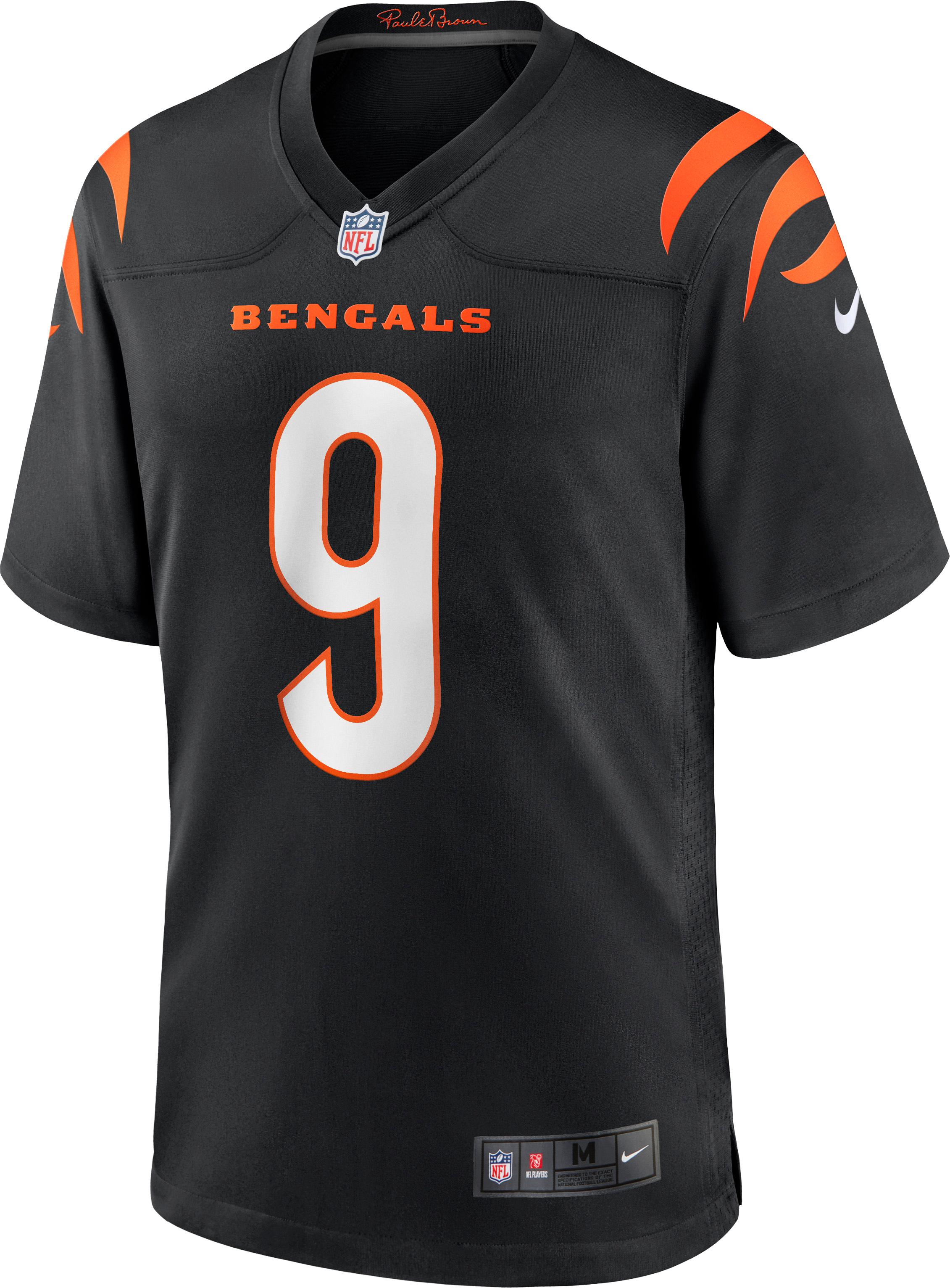 American Football-Trikot der Cincinnati Bengals und der Spielernummer und Namensschriftzug von Joe Burrow; gerippter V-Ausschnitt mit Necktape und Trainer Pauli Brown-Schriftzug; kleines NFL-Badge am Ausschnitt; kurze Ärmel mit Rippbündchen; Grafiken auf den Schultern; Material 100% Polyester.