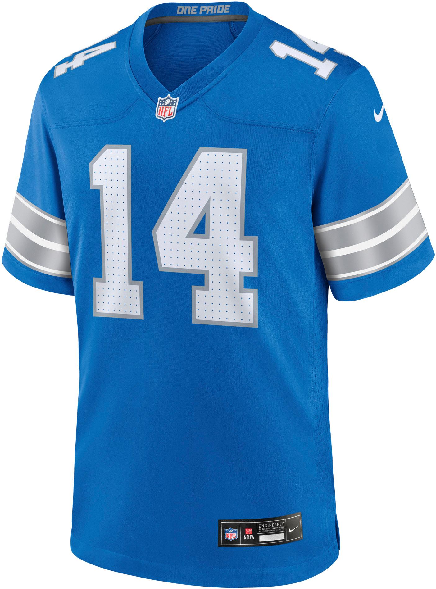 Detroit Lions Heimtrikot in 2 Varianten; mit Spielername Goff und Nummer 16 oder mit Spielername St Brown und Nummer 14; leichtes, atmungsaktives Material mit Seiteneinsätzen aus Mesh für extra Luftzirkulation; V-Ausschnitt; Streifen an den Ärmeln; Saum mit kurzen Seitenschlitzen; NFL-Wappen am Ausschnitt und Label am Saum; Material 100% Polyester.