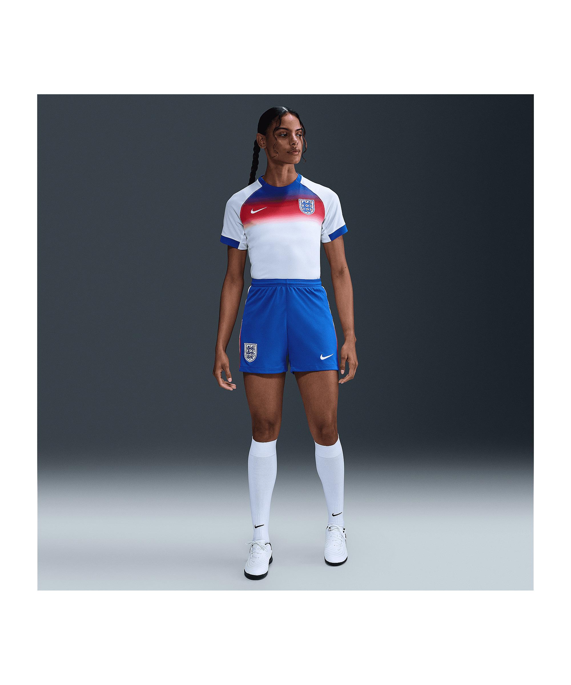 Mit der Nike England Short 2025 für Damen kannst du dein Team bei jedem Match stilvoll unterstützen. Diese Shorts sind genau das Richtige für alle England-Fans, die auch auf dem Platz Flagge zeigen wollen. Die Nike England Short 2025 Damen ist perfekt für den Einsatz bei Matches. Sie vereint sportlichen Style mit Funktionalität und ist ideal für alle, die sich mit dem englischen Team verbunden fühlen. Dank der Dri-FIT-Technologie bleibst du auch bei hitzigen Spielen angenehm trocken und kühl. Das schnell trocknende Gewebe sorgt dafür, dass du dich voll und ganz auf dein Spiel konzentrieren kannst. Das Verbandslogo auf der Hose zeigt deine Unterstützung für das englische Team und verleiht dir den Look eines echten Profis. Schnapp dir die Nike England Short 2025 Damen und erlebe, wie die Qualität von Nike dich auf dem Platz unterstützt. Du wirst den Unterschied spüren! Produktdetails:Herstellerfarbbezeichnung: HYPER ROYAL/WHITE/CHALLENGE RED/WHITEHauptfarbe: BlauTechnologie: Dri-FITTechnologie-Eigenschaften: atmungsaktiv, komfortabel, robust, leicht, schweißableitendMaterial: 100% Polyester