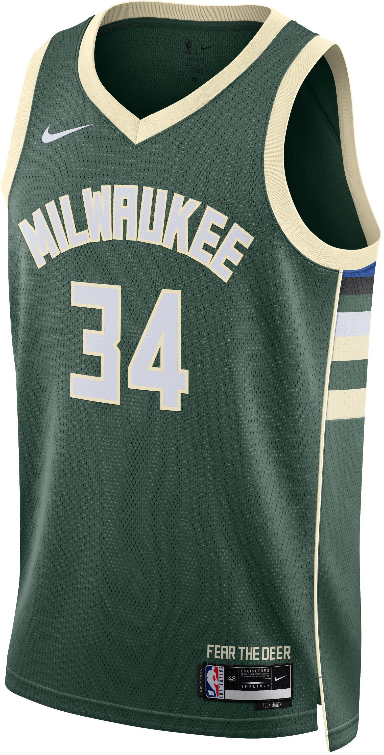Ärmelloses Basketball-Trikot mit der Spielernummer von Giannis Antetokounmpo von den Milwaukee Bucks; V-Ausschnitt; Swoosh-Logo, Nummer und Milwaukee-Schriftzug auf der Vorderseite; NBA-Patch, Nummer und Namensschriftzug auf der Rückseite; Streifen an der Seite; verlängertes Rückenteil; Seitenschlitze; feuchtigkeitsregulierend und schnelltrocknend dank Dri-FIT-Technologie; Material 100% Polyester.