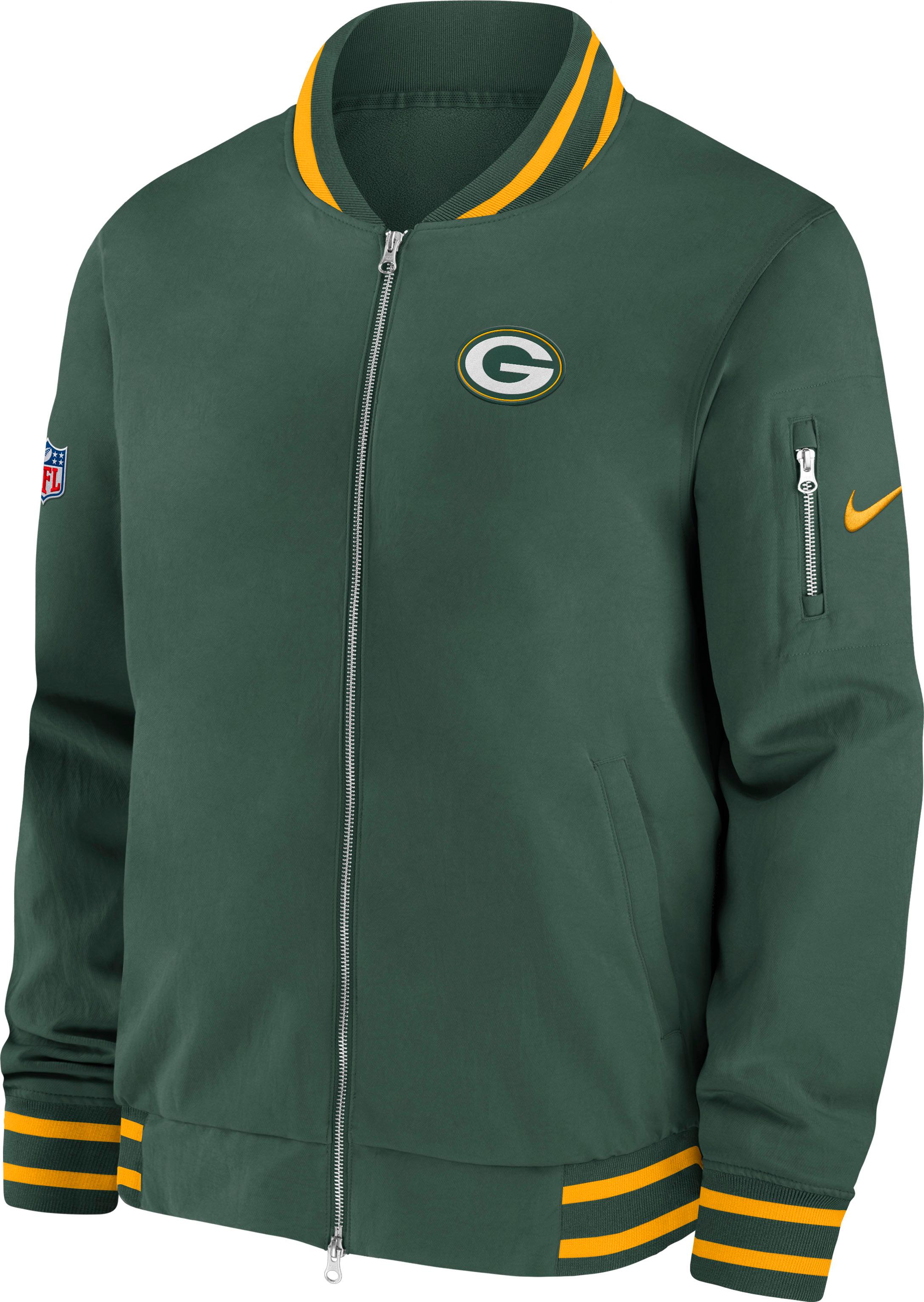 Bomberjacke im Design der Green Bay Packers; durchgehender Frontreißverschluss; Logodetails auf Brust, Ärmeln und Rücken; Reißverschlusstasche am Oberarm und 2 seitliche Eingrifftaschen; Kragen, Saum und Ärmelbündchen mit gestreiftem Rippmaterial; Material 100% Polyester.