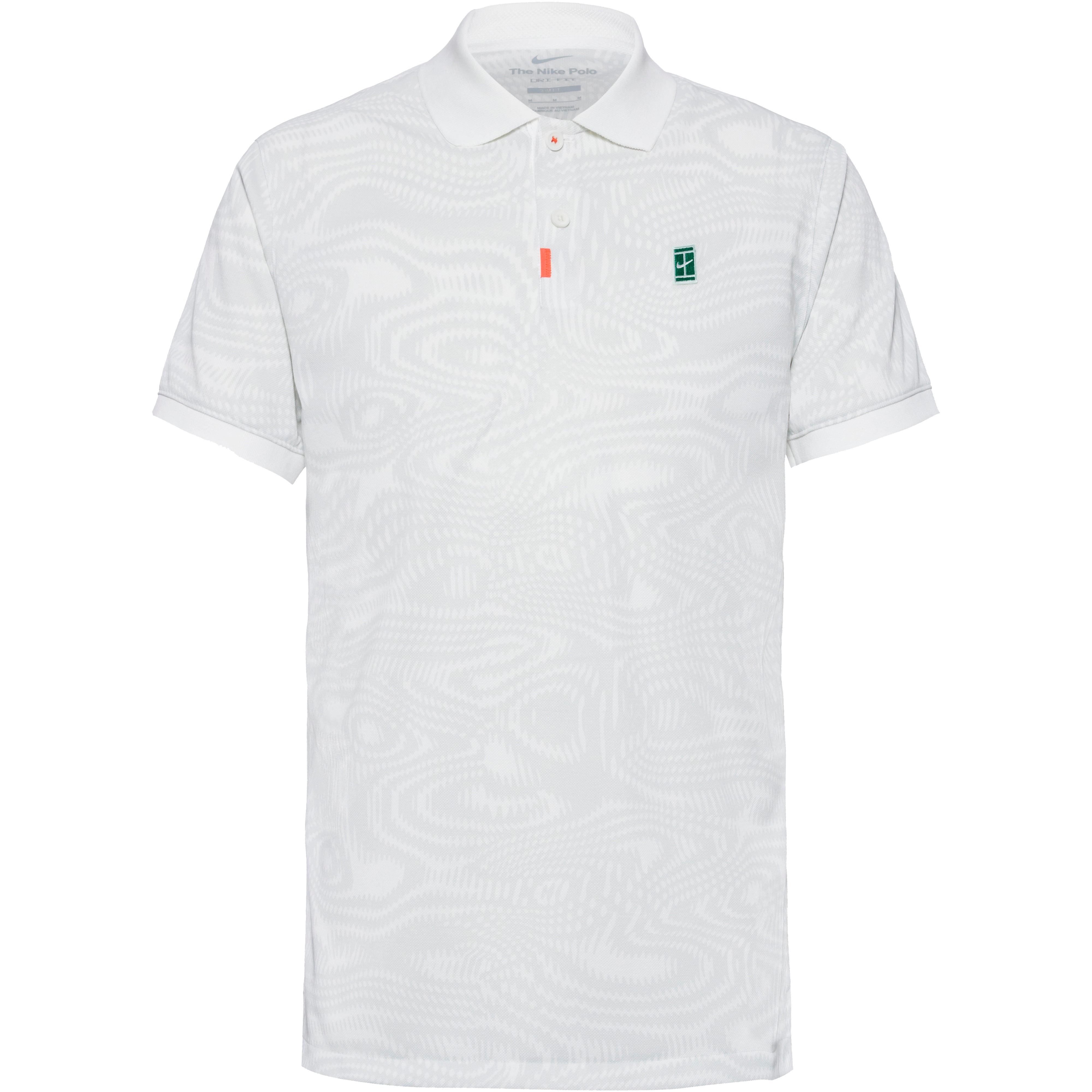 Tennis-Poloshirt aus elastischem Material mit Moiré-Print; klassischer Polokragen und Knopfleiste; atmungsaktiv, feuchtigkeitsregulierend und schnelltrocknend dank Dri-FIT-Technologie; verlängerte Rückseite und seitlich geschlitzter Saum; gestickte Ösen unter den Armen; Label-Patch auf Brusthöhe; Material 100% Polyester.