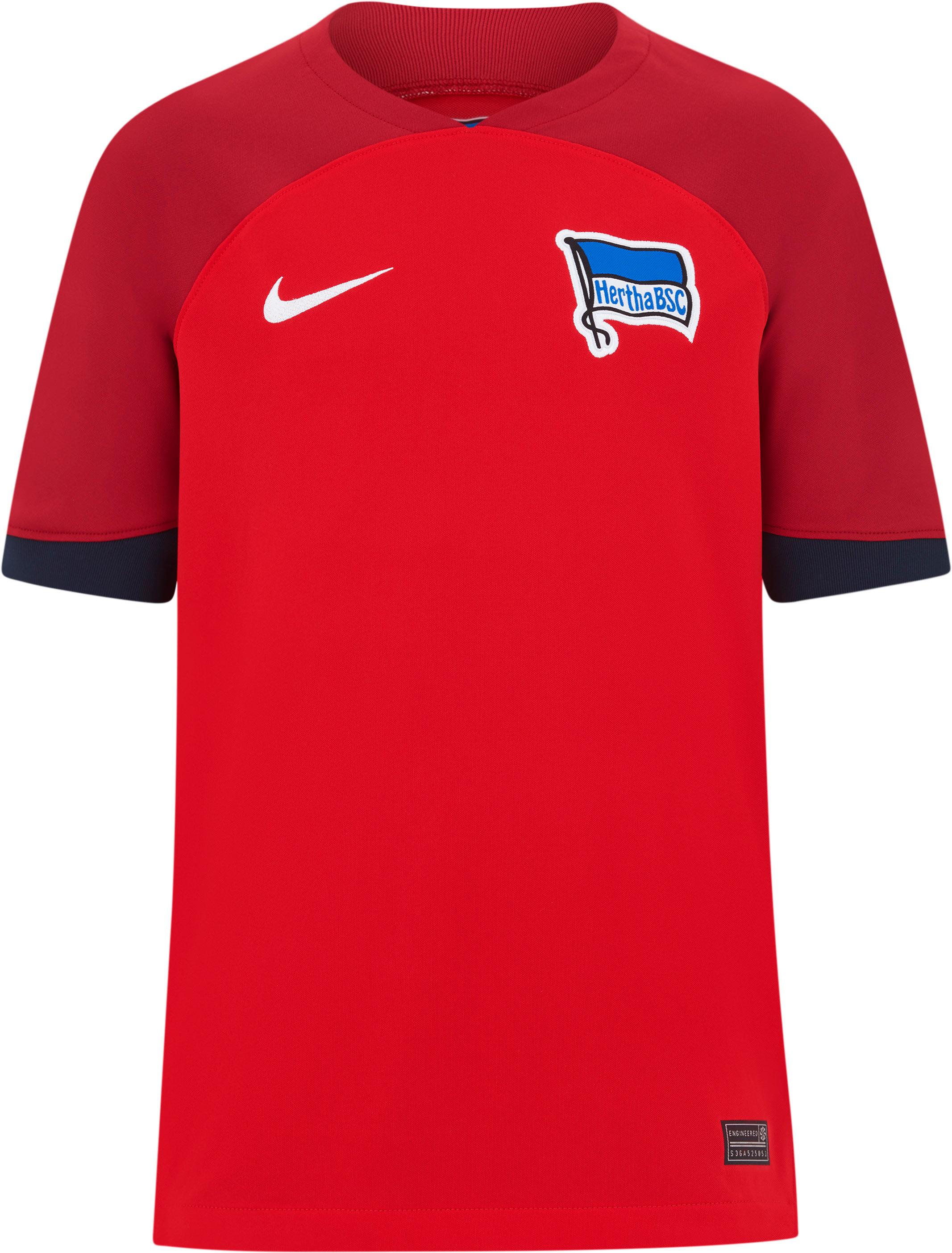 Kinder-Fußballtrikot im Design des Hertha BSC 23/24; feuchtigkeitsableitend, schnelltrocknend und atmungsaktiv dank Dri-FIT-Funktion; Swoosh und Club-Wappen auf der Brust; Material 100% Polyester.