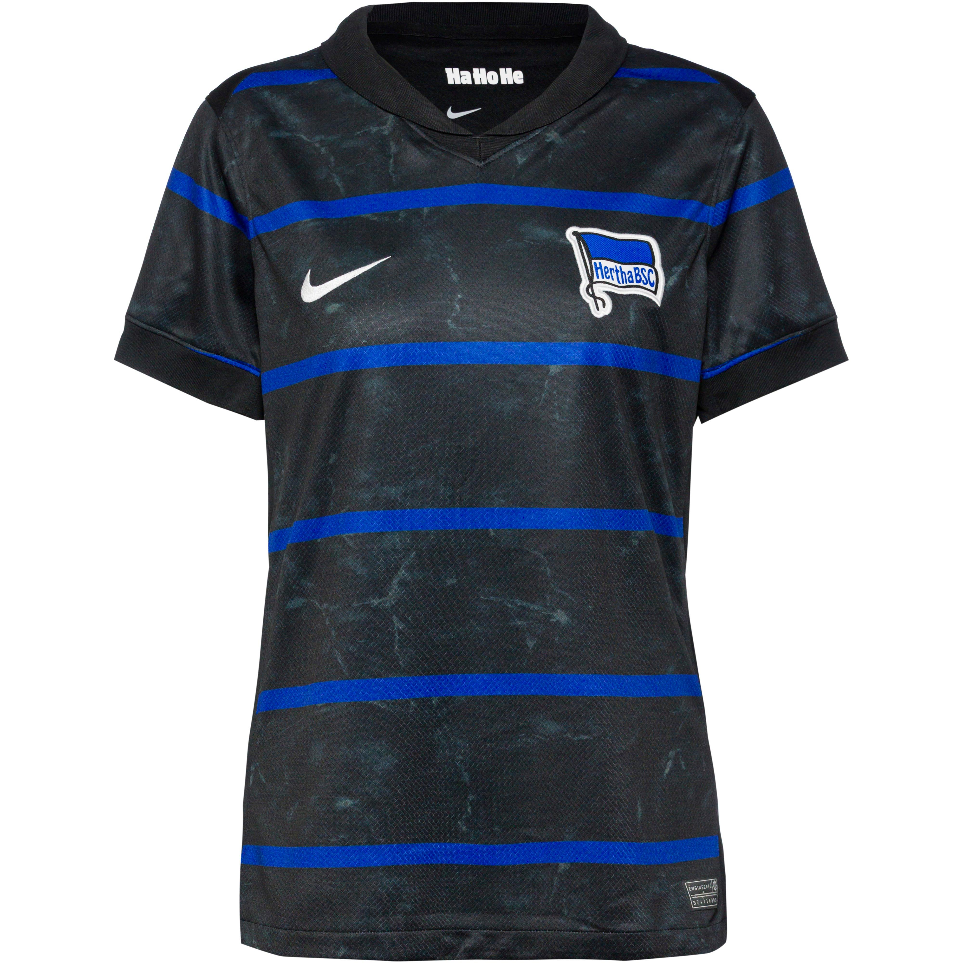 Auswärtstrikot von Hertha BSC (Saison 2024/25) für Damen; gestreiftes Design; feuchtigkeitsableitend und schnelltrocknend dank Dri-FIT-Technologie; V-Ausschnitt mit Nackenband; Vereinswappen und Swoosh-Logo auf der Vorderseite; taillierter Schnitt; normale Passform; Material 100% Polyester.