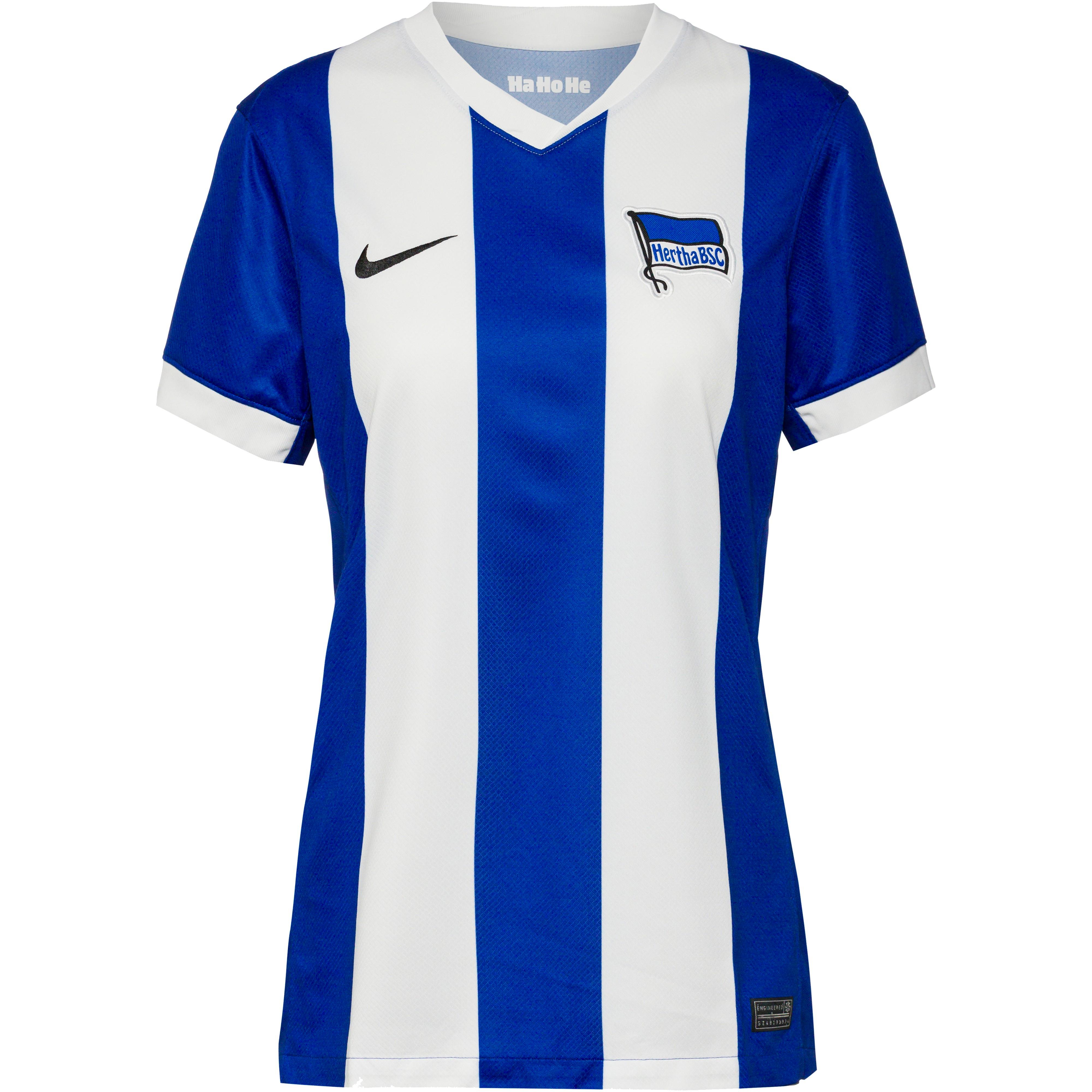 Damen-Heimtrikot von Hertha BSC für die Saison 2024/25; feuchtigkeitsableitend und schnelltrocknend dank Dri-FIT-Technologie; gestreiftes Design in den Vereinsfarben; V-Ausschnitt mit Nackenband; Vereinswappen und Swoosh-Logo auf der Vorderseite; taillierter Schnitt; normale Passform; Material 100% Polyester.