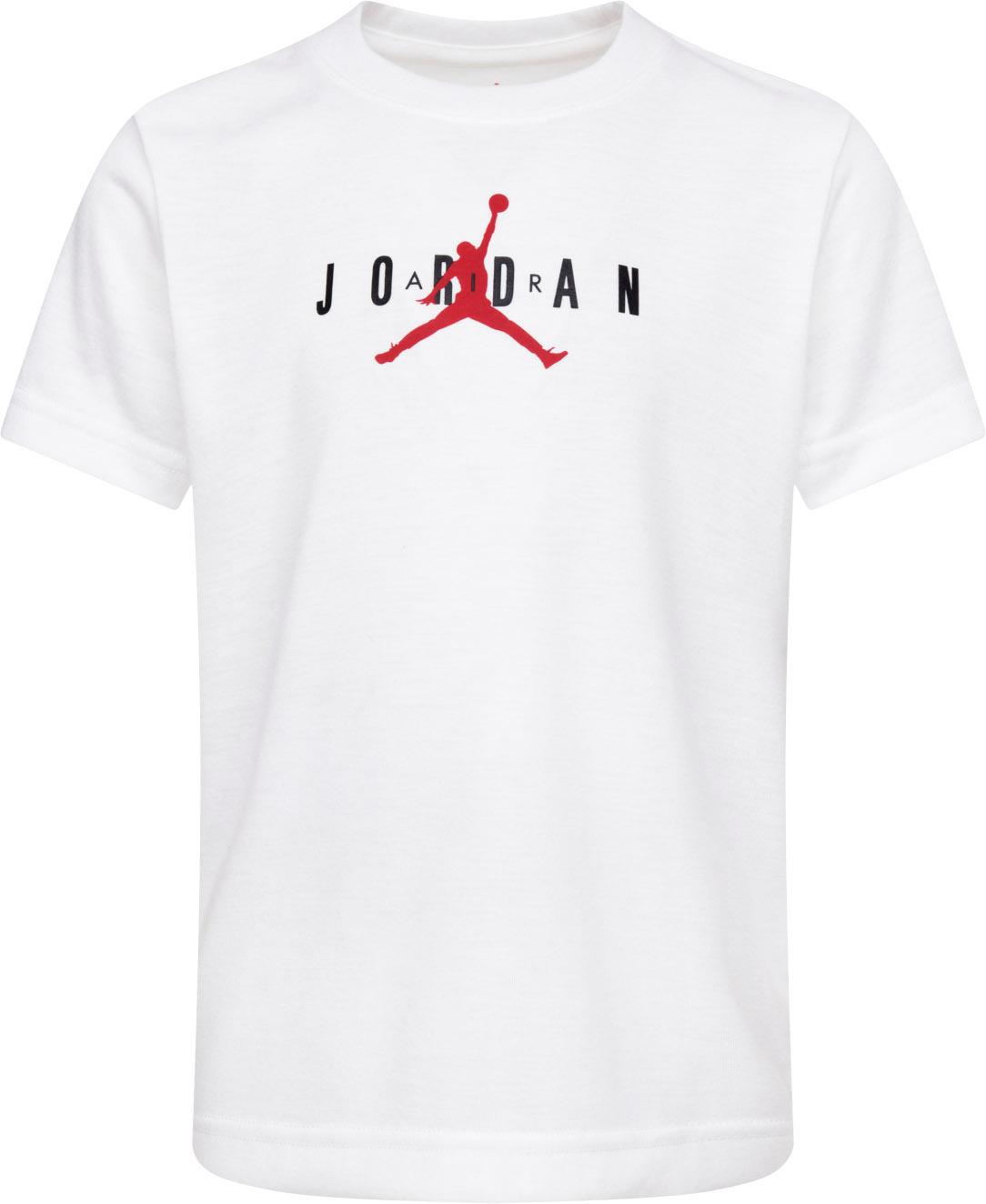 T-Shirt mit Jordan-Schriftzug und Jumpman-Print; gerippter Rundhalsausschnitt mit weichem Nackenband; weicher Griff; Material 100% Polyester.