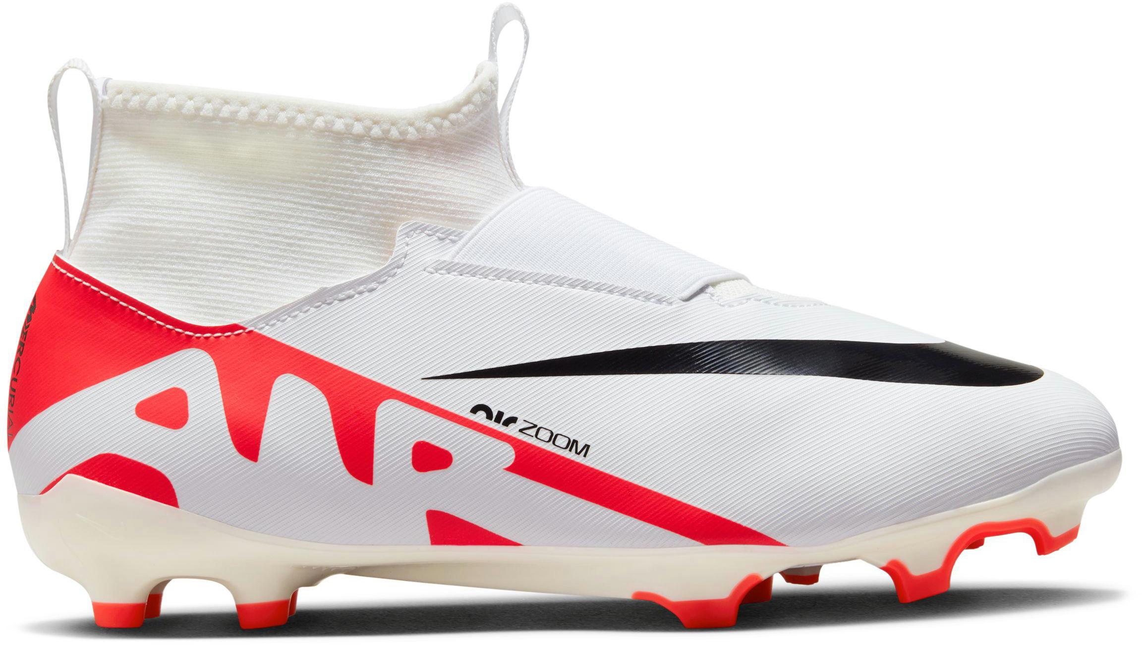 Leistungsstarke Fußballschuhe für Kinder; aus der Mercurial-Kollektion, die u.a. von Kylian Mbappe und Christiano Ronaldo getragen wird; dünner NikeSkin-Überzug sorgt für hervorragenden Ballkontakt; elastische Riemen und Zuglaschen an Zunge und Ferse für einfaches Hineinschlüpfen; Zoom Air-Element für schnelle, reaktionsfreudige Dämpfung; Speed-Cage aus dünnem, starkem Material fixiert den Fuß an der Außensohle und sorgt für Halt; Außensohle mit konischen Stollen bietet optimale Traktion auf Natur- und Kunstrasen.