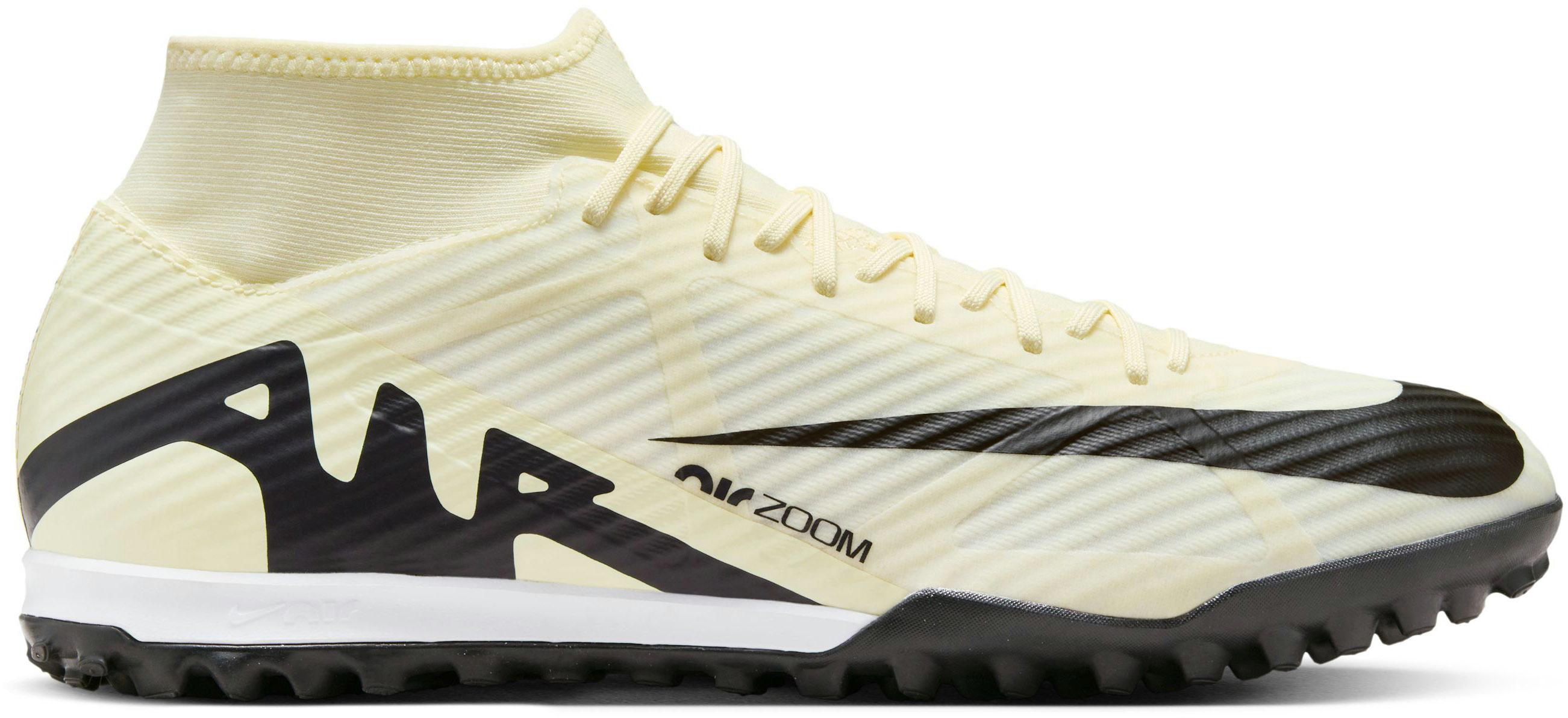 Fußballschuhe mit flexiblem NikeSkin-Obermaterial für optimalen Ballkontakt und ein präzises Ballgefühl; aus der Mercurial-Kollektion, die u.a. von Christiano Ronaldo und Jadon Sancho getragen wird; sockenähnlicher Knöchelbereich aus elastischem Flyknit-Material für exakten Halt und Flexibilität; verbesserte Passform mit stärker konturiertem Zehenbereich und mehr Halt in der Ferse; klassische Schnürung; dämpfende Zwischensohle mit Zoom Air-Element für ein reaktionsfreudiges Tragegefühl; dünner aber starker Speed-Cage fixiert den Fuß und gibt Halt; genoppte Gummi-Außensohle für hervorragende Traktion auf Kunstrasen, Hart- und Aschenplätzen.