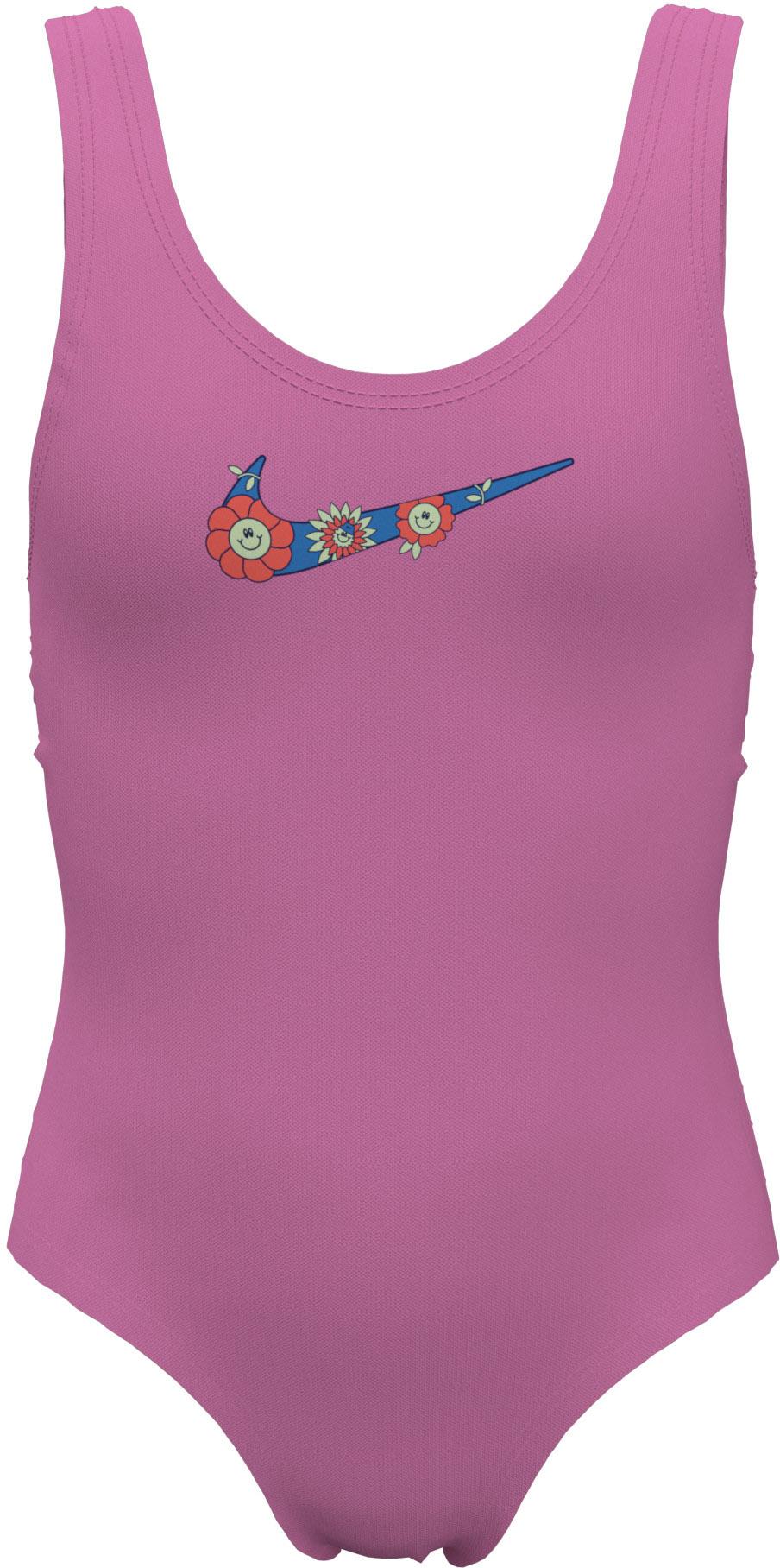 Einfarbiger Badeanzug mit buntem Swoosh-Logo auf der Vorderseite; elastisches Material; tiefer Rundhalsausschnitt; mittlerer, u-förmiger Rückenausschnitt; mittlerer Beinausschnitt; Material 80% Polyamid, 20% Elastan, Futter: 100% Polyester.