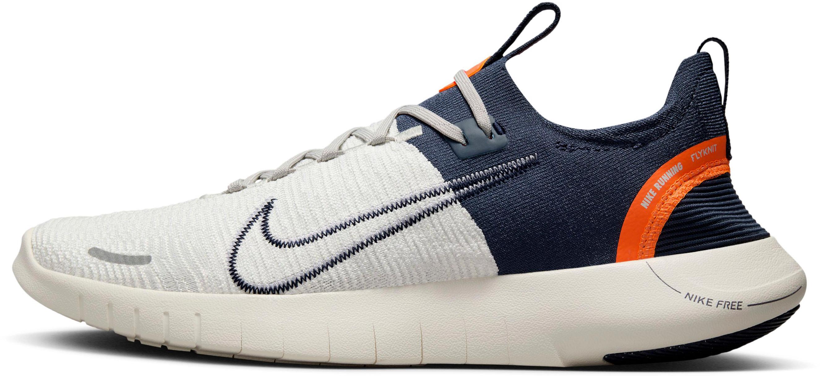 Laufschuhe mit barfußähnlichem Tragegefühl; enganliegendes Flyknit-Obermaterial für exakten Halt und Flexibilität; atmungsaktiv und elastisch; klassische Schnürung; einfaches Anziehen mit Zuglaschen an Zunge und Ferse; sehr leichte Mittelsohle aus weichem, reaktionsfreudigem Schaumstoff; Außensohle aus mindestens 13% Nike Grind-Material aus recycelten Produktionsresten; lasergeschnittene Kerben für mehr Flexibilität in der Sohle; ideal für Straße und Park sowie für Wald- und Feldwege geeignet; normale Pronation und normale Schuhweite.