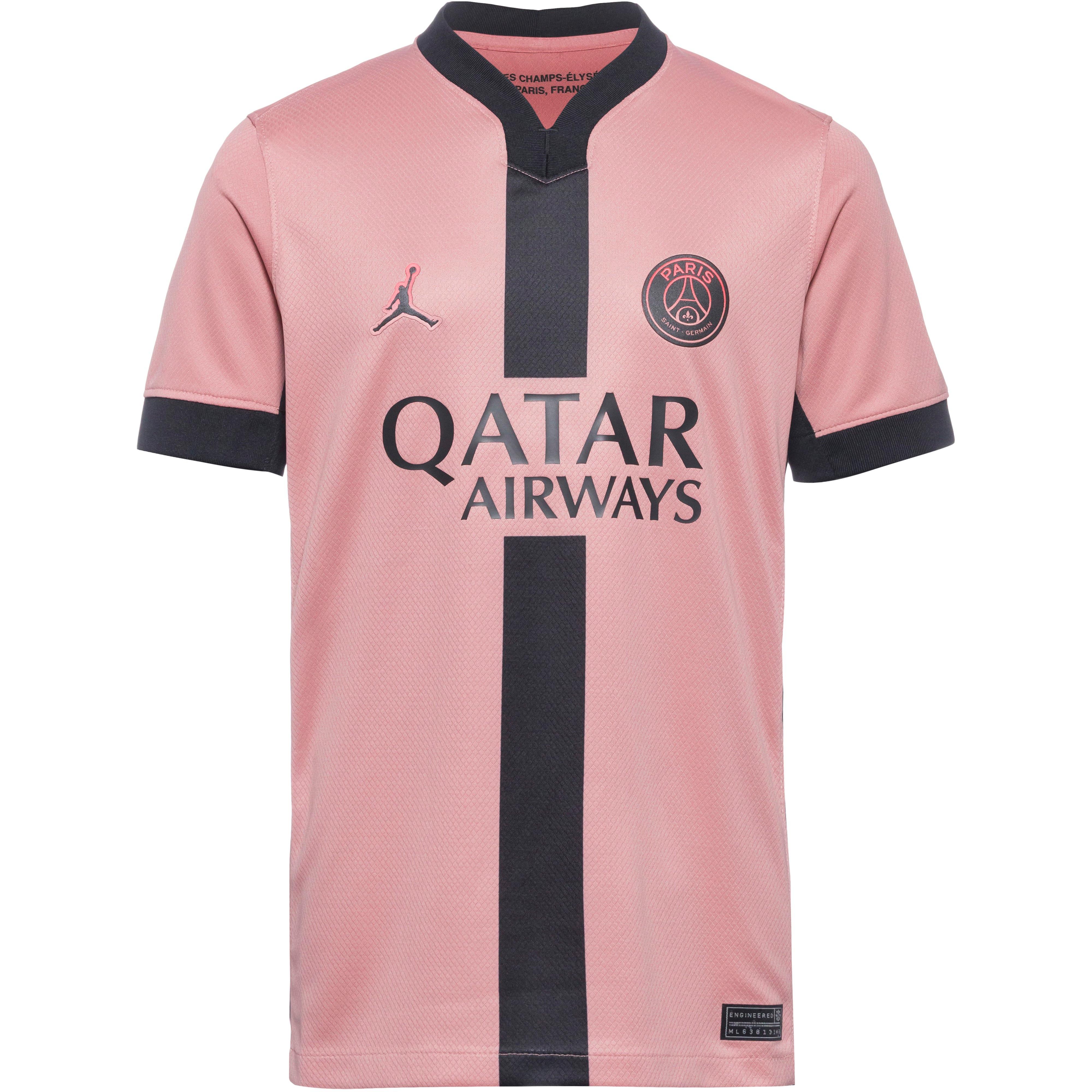 Kinder-Ausweichtrikot des FC Paris Saint-Germain, Saison 24/25; mit Vereinslogo, Jumpman-Logo und Sponsorenprint; V-Ausschnitt; kontrastfarbene Akzente; mit weichem Nackenband; atmungsaktiv schnelltrocknend und feuchtigkeitsregulierend dank Dri-FIT-Technologie; Material 100% Polyester.