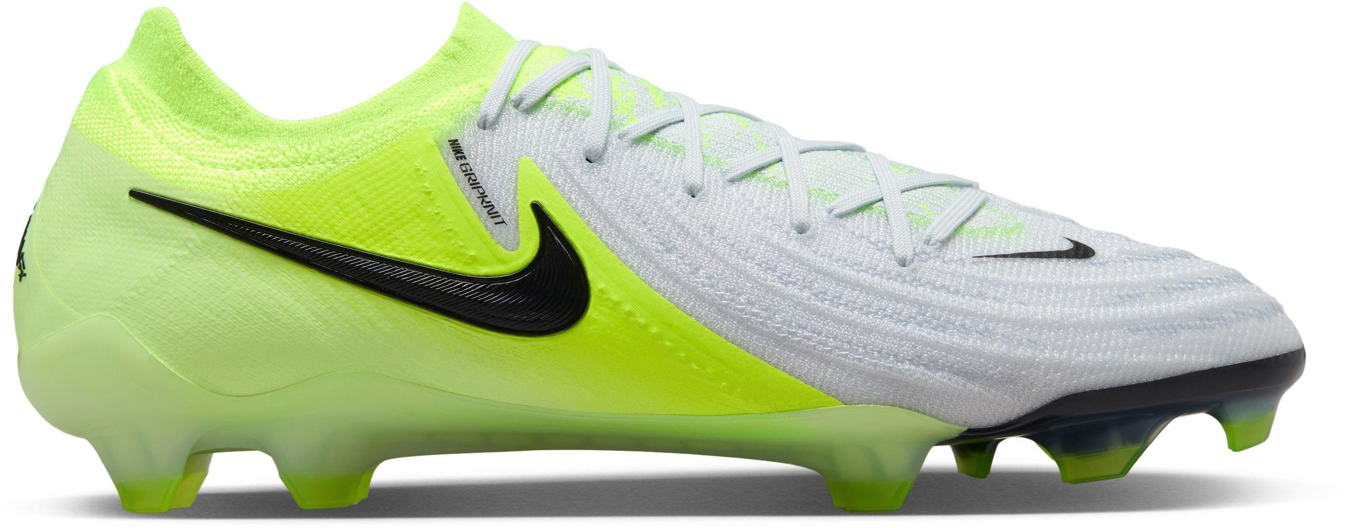 Fußballschuhe mit griffig strukturierter Kontaktzone für bessere Ballkontrolle bei jedem Wetter; aus der Phantom-Kollektion, die u.a. von Kai Havertz und Robert Lewandowski getragen wird; Schaft mit Flyknit-Technologie für exakten Halt und Flexibilität; asymmetrische Schnürung; gedämpfte Innensohle; Satabilität bei schnellen Bewegungen dank Außensohle mit Stollen und Nike Cyclone 360 Traktionsmuster; für den Einsatz auf Naturrasen.